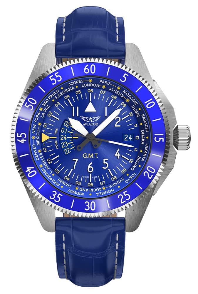 Pánské hodinky Aviator Airacobra GMT V13703084 jsou uzavřeny v kulatém pouzdře z nerezové oceli 316L. Pouzdro o průměru 42,80 mm bylo utěsněno až na 100 metrů, což vám umožňuje plavat s hodinkami, aniž byste se museli obávat jejich poškození. Na pravé straně je velká, snadno použitelná krajka. Přední strana hodinek byla obohacena o jednosměrnou lunetu s minutovou stupnicí. Luneta podporuje funkci světového času. Na očka hodinek je připevněn modrý kožený řemínek s klasickým zapínáním na přezku. Popruh je lehký a měkký, což zajistí pohodlí při jeho používání.