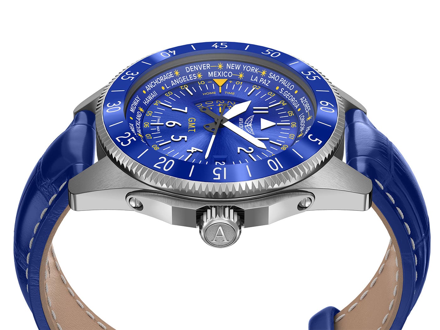 Pod těžko poškrábatelným antireflexním safírovým sklíčkem se skrývá modrý ciferník bohatý na funkce. Na vnější části štítu je stupnice s městy z celého světa. Hodinky mají funkci 24hodinového druhého časového pásma a funkci světového času ovládanou otočnou lunetou. Ve 3 hodiny je datumové okno s aktuálním dnem v měsíci. Výrobce usnadňuje odečítání času i v naprosté tmě díky podsvícení Super-LumiNova .