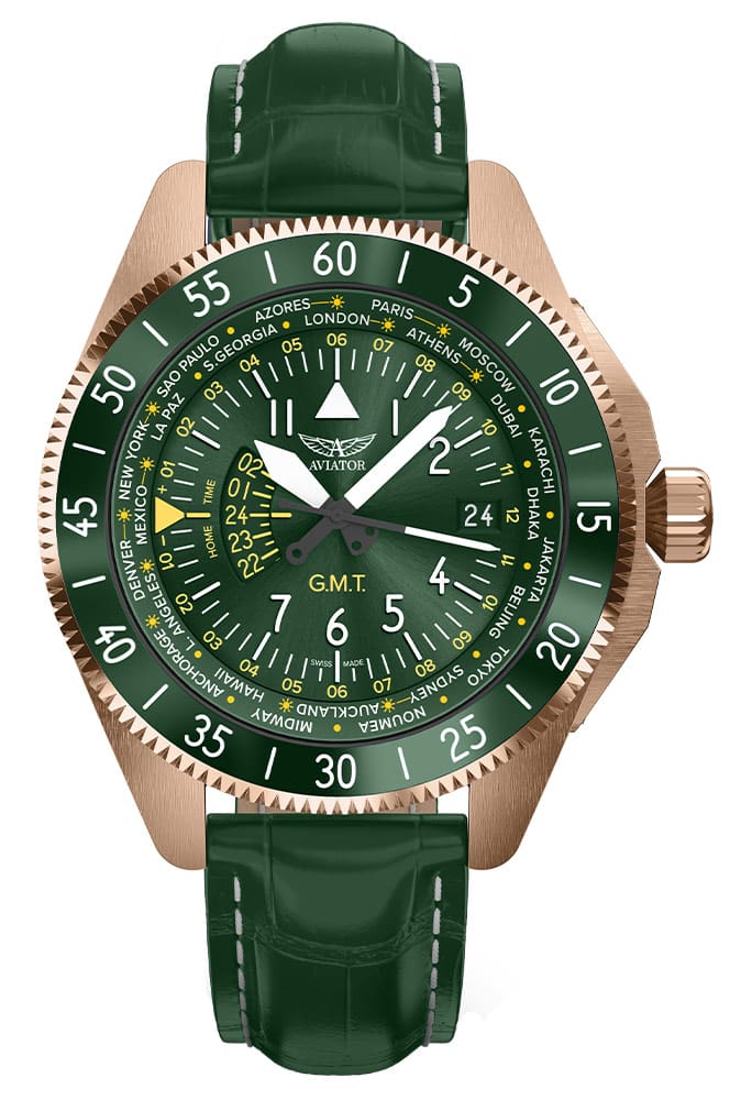 Pod těžko poškrábatelným antireflexním safírovým sklíčkem se skrývá zelený ciferník bohatý na funkce. Na vnější části štítu je stupnice s městy z celého světa. Hodinky mají funkci 24hodinového druhého časového pásma a funkci světového času ovládanou otočnou lunetou. Ve 3 hodiny je datumové okno s aktuálním dnem v měsíci. Výrobce usnadňuje odečítání času i v naprosté tmě díky podsvícení Super-LumiNova .