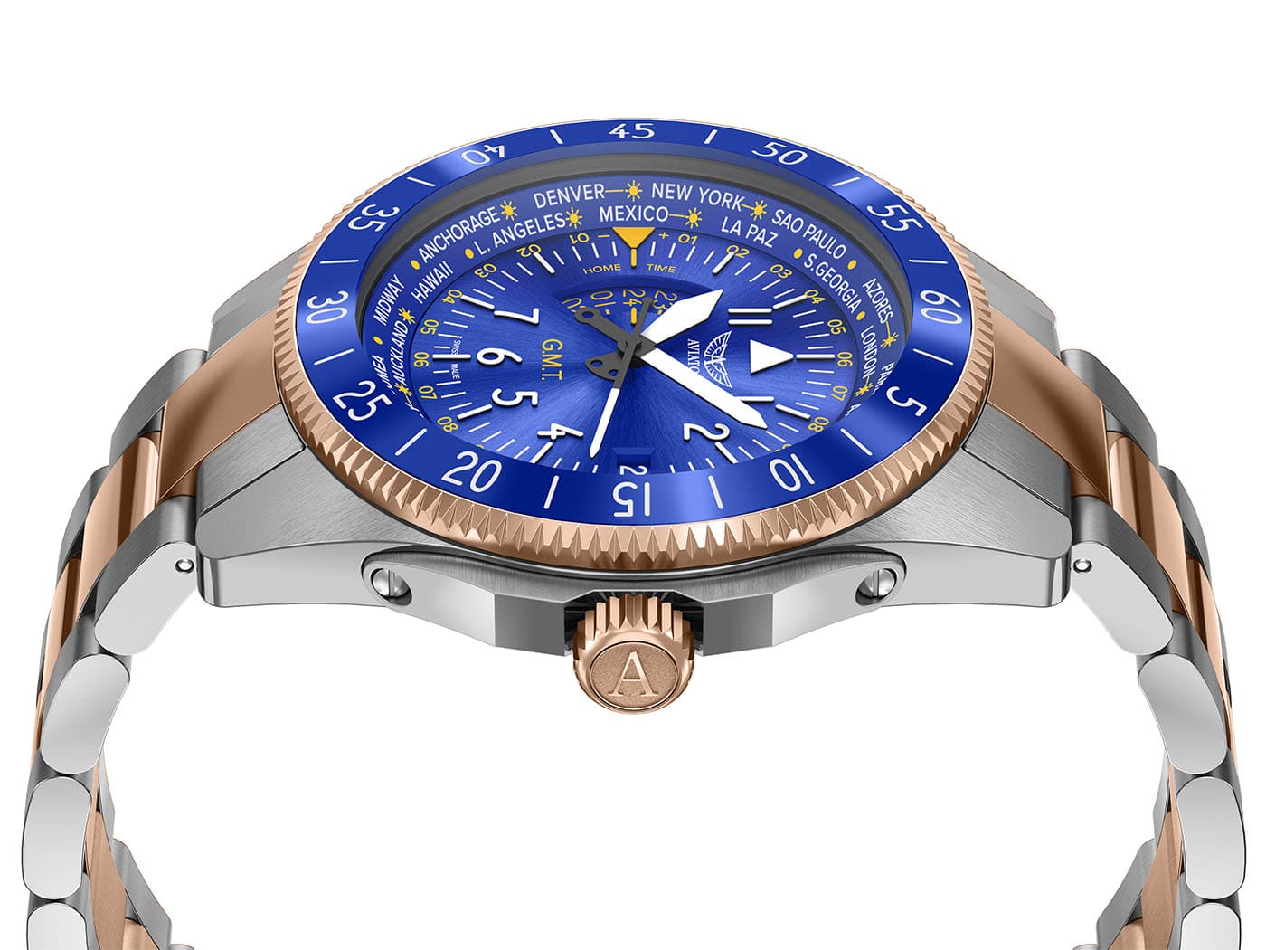 Pod těžko poškrábatelným antireflexním safírovým sklíčkem se skrývá modrý ciferník bohatý na funkce. Na vnější části štítu je stupnice s městy z celého světa. Hodinky mají funkci 24hodinového druhého časového pásma a funkci světového času ovládanou otočnou lunetou. Ve 3 hodiny je datumové okno s aktuálním dnem v měsíci. Výrobce usnadňuje odečítání času i v naprosté tmě díky podsvícení Super-LumiNova .