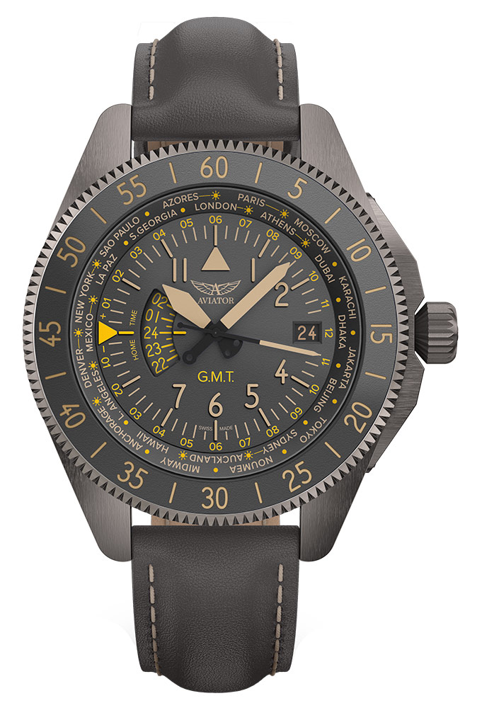 Pánské hodinky Aviator Airacobra GMT V13773054 jsou uzavřeny v kulatém pouzdře z nerezové oceli 316L s šedým PVD povlakem. Pouzdro o průměru 42,80 mm bylo utěsněno až na 100 metrů, což vám umožňuje plavat s hodinkami, aniž byste se museli obávat jejich poškození. Na pravé straně je velká, snadno použitelná krajka. Přední strana hodinek byla obohacena o jednosměrnou lunetu s minutovou stupnicí. Luneta podporuje funkci světového času. Na očka hodinek je připevněn šedý kožený řemínek s klasickým zapínáním na přezku. Popruh je lehký a měkký, což zajistí pohodlí při jeho používání.