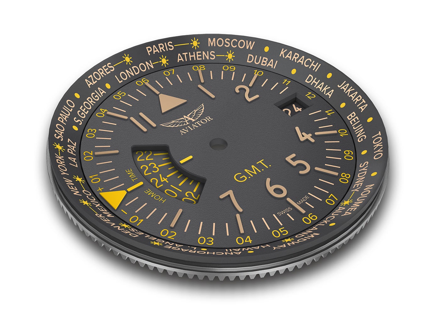 Pod těžko poškrábatelným antireflexním safírovým sklíčkem se skrývá šedý ciferník bohatý na funkce. Na vnější části štítu je stupnice s městy z celého světa. Hodinky mají funkci 24hodinového druhého časového pásma a funkci světového času ovládanou otočnou lunetou. Ve 3 hodiny je datumové okno s aktuálním dnem v měsíci. Výrobce usnadňuje odečítání času i v naprosté tmě díky podsvícení Super-LumiNova .