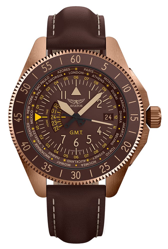 Pánské hodinky Aviator Airacobra GMT V13783064 jsou uzavřeny v kulatém pouzdře z nerezové oceli 316L s hnědým PVD povlakem. Pouzdro o průměru 42,80 mm bylo utěsněno až na 100 metrů, což vám umožňuje plavat s hodinkami, aniž byste se museli obávat jejich poškození. Na pravé straně je velká, snadno použitelná krajka. Přední strana hodinek byla obohacena o jednosměrnou lunetu s minutovou stupnicí. Luneta podporuje funkci světového času. Na očka hodinek je připevněn hnědý kožený řemínek s klasickým zapínáním na přezku. Popruh je lehký a měkký, což zajistí pohodlí při jeho používání.