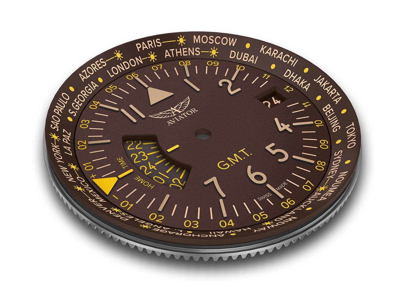 Pod těžko poškrábatelným antireflexním safírovým sklíčkem se skrývá bronzový číselník s bohatými funkcemi. Na vnější části štítu je stupnice s městy z celého světa. Hodinky mají funkci 24hodinového druhého časového pásma a funkci světového času ovládanou otočnou lunetou. Ve 3 hodiny je datumové okno s aktuálním dnem v měsíci. Výrobce usnadňuje odečítání času i v naprosté tmě díky podsvícení Super-LumiNova .