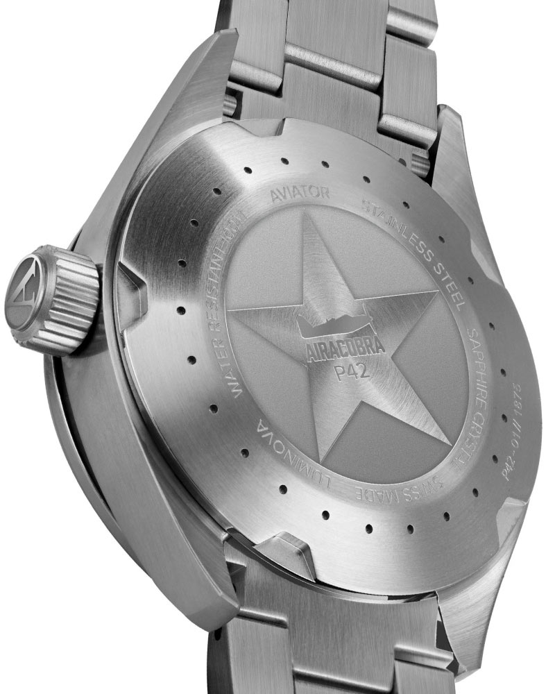 Na zadní straně hodinek se nachází šroubovací záda pouzdra a stejně jako v případě korunky posiluje těsnost hodinek. Zadní stranu pouzdra zdobí hvězda a v jejím středu je rovina, která si zaslouží pár okamžiků pozornosti. Tato stíhačka je americká stíhačka Bell Airacobra P-39, jejímž výrobcem byl Bell Aircraft z období 2. světové války. Jeho první let se uskutečnil 6. dubna 1938 a Originně byl zamýšlen jako doprovodný letoun pro bombardéry, ale nakonec výrobce změnil jeho roli na útočnou stíhačku.