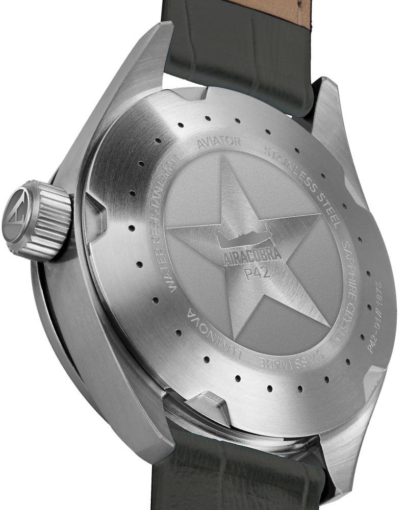 Na zadní straně hodinek se nachází šroubovací záda pouzdra a stejně jako v případě korunky posiluje těsnost hodinek. Na zadní straně pouzdra jsou jemné popisy odkazující na konstrukci trupu letadla Airacobra. Zadní stranu pouzdra zdobí hvězda a v jejím středu je rovina, která si zaslouží pár okamžiků pozornosti. Tato stíhačka je americká stíhačka Bell Airacobra P-39, jejímž výrobcem byl Bell Aircraft z období 2. světové války. Jeho první let se uskutečnil 6. dubna 1938 a Originně byl zamýšlen jako doprovodný letoun pro bombardéry, ale nakonec výrobce změnil jeho roli na útočnou stíhačku.