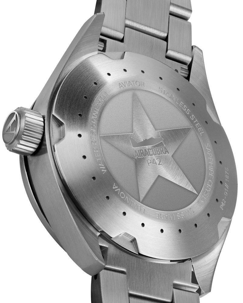 Na zadní straně hodinek se nachází šroubovací záda pouzdra a stejně jako v případě korunky posiluje těsnost hodinek. Zadní stranu pouzdra zdobí hvězda a v jejím středu je rovina, která si zaslouží pár okamžiků pozornosti. Tato stíhačka je americká stíhačka Bell Airacobra P-39, jejímž výrobcem byl Bell Aircraft z období 2. světové války. Jeho první let se uskutečnil 6. dubna 1938 a Originně byl zamýšlen jako doprovodný letoun pro bombardéry, ale nakonec výrobce změnil jeho roli na útočnou stíhačku.