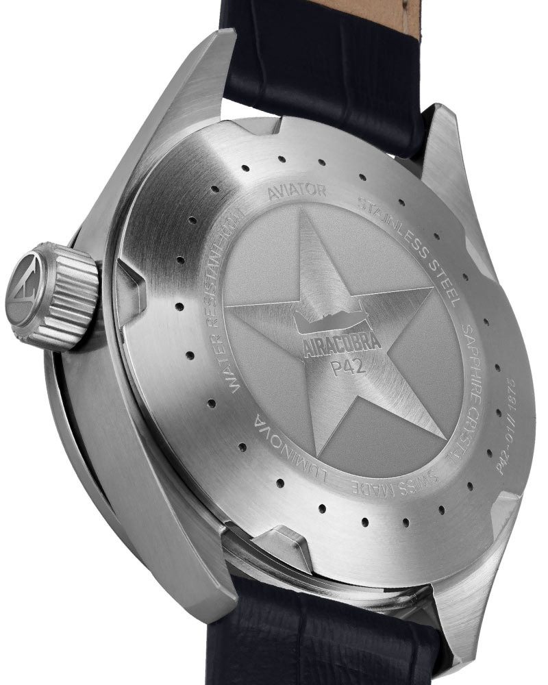 Na zadní straně hodinek se nachází šroubovací záda pouzdra a stejně jako v případě korunky posiluje těsnost hodinek. Na zadní straně pouzdra jsou jemné popisy odkazující na konstrukci trupu letadla Airacobra. Zadní stranu pouzdra zdobí hvězda a v jejím středu je rovina, která si zaslouží pár okamžiků pozornosti. Tato stíhačka je americká stíhačka Bell Airacobra P-39, jejímž výrobcem byl Bell Aircraft z období 2. světové války. Jeho první let se uskutečnil 6. dubna 1938 a Originně měl být doprovodným letounem pro bombardéry, ale nakonec výrobce změnil jeho roli na útočnou stíhačku.
