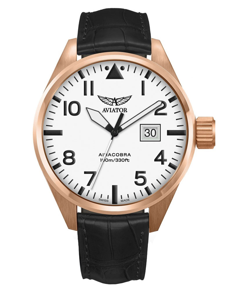 Aviator Airacobra P42 V12221524 je kulaté pouzdro z 316L růžového zlata PVD z kartáčované nerezové oceli o velikosti 316L v pánské velikosti 42 mm . Pouzdro je utěsněno na 100 metrů, což vám umožňuje plavat s hodinkami na zápěstí. Na pravé straně pouzdra je šroubovací korunka, velká a snadno použitelná. Na očka pouzdra je připevněn elegantní černý kožený řemínek s exotickým vzorem a zapínáním na přezku. Přezka je vyrobena tak, že odkazuje na aerodynamická letadla. Výrazný bílý ciferník chrání safírové sklíčko vysoce odolné proti poškrábání . Na ciferníku jsou kontrastní indexy smíchané s číslicemi a ručičky pokryté svítícím luma, což umožňuje snadné odečítání času i ve tmě. Na 3 hodiny umístil výrobce datumové okno s aktuálním dnem v měsíci. Celý číselník je navržen v leteckém stylu. Hodinky bijí quartzové srdce napájené baterií - ETA F06.161 je švýcarský Machineek, který zajistí přesné měření času. Aviator Airacobra bude skvělým doplňkem každého pánského šatníku. Hodinky v módním stylu a barvách se budou líbit k mnoha outfitům - elegantním i každodenním.
