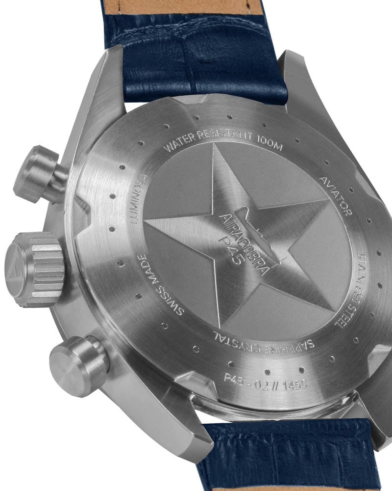 Na zadní straně hodinek se nachází šroubovací záda pouzdra a stejně jako v případě korunky posiluje těsnost hodinek. Najdeme na něm jemné popisy odkazující na konstrukci trupu letounu Airacobra. Zadní stranu pouzdra zdobí také hvězda a v jejím středu je rovina, která si zaslouží pár okamžiků pozornosti. Tato stíhačka je americká stíhačka Bell Airacobra P-39, jejímž výrobcem byl Bell Aircraft z období 2. světové války. Jeho první let se uskutečnil 6. dubna 1938 a Originně byl zamýšlen jako doprovodný letoun pro bombardéry, ale nakonec výrobce změnil jeho roli na útočnou stíhačku.