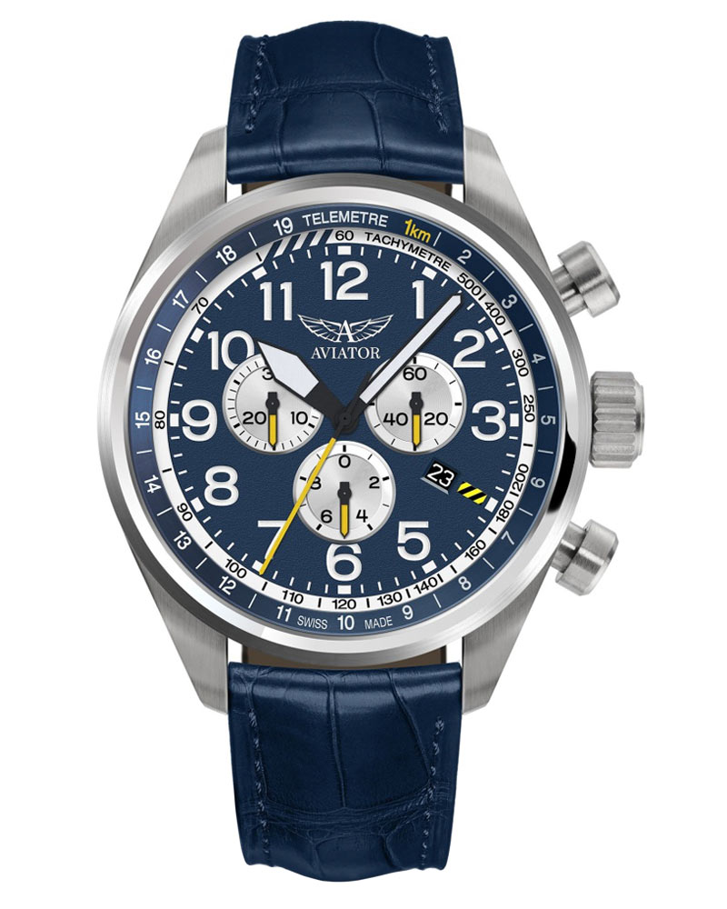Aviator Airacobra P45 Chrono V22501704 je 45mm kulaté pouzdro z kartáčované nerezové oceli utěsněné na 100 metrů. Na pravé straně pouzdra je šroubovací korunka, velká a snadno ovladatelná a funkční tlačítka. K uším je připevněn elegantní kožený řemínek z vyčiněné kůže s exotickým vzorem a zapínáním na přezku. Spona je vyrobena tak, že odkazuje na aerodynamická letadla. Safírové sklíčko vysoce odolné proti poškrábání s antireflexní ochranou chrání modrý kontrastní ciferník s velkými ručičkami a arabskými číslicemi, které jsou překryty svítící lumou, která umožňuje snadné odečítání času i ve tmě. Na 4. hodinu výrobce umístil datumové okénko s aktuálním dnem v měsíci. Hodinky jsou vybaveny více funkcemi - chronografem, jinak známým jako stopky, tachymetrem a telemetrem. Chronograf vám umožní měřit přesný čas například kol v různých typech závodů. Tachymetr bude měřit průměrnou rychlost pohybu na vzdálenost jednoho kilometru. Funkce telemetru hodinek se obvykle používá k měření vzdálenosti mezi nositelem hodinek a jevem, který je pozorován a slyšen současně, jako je exploze nebo blesk. Telemetr má svou stupnici umístěnou na lunetě hodinek. V hodinkách bije quartzové srdce na baterie - Ronda 5040D je švýcarský Machineek a zajistí přesné měření času.