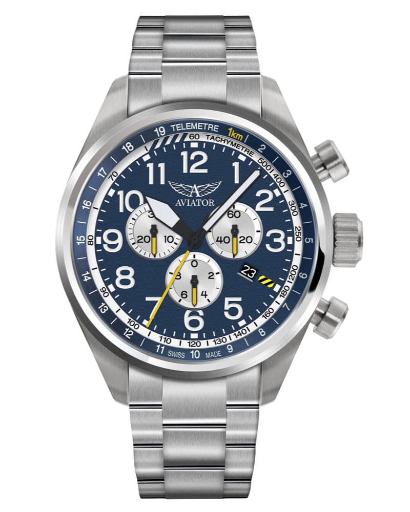 Aviator Airacobra P45 Chrono V22501705 je 45mm kulaté pouzdro z kartáčované nerezové oceli utěsněné na 100 metrů. Na pravé straně pouzdra je šroubovací korunka, velká a snadno ovladatelná a funkční tlačítka. K uším je připevněn náramek kombinovaný s velkými články s bezpečnou a pohodlnou motýlkovou sponou. Safírové sklíčko vysoce odolné proti poškrábání s antireflexní ochranou chrání modrý kontrastní ciferník s velkými ručičkami a arabskými číslicemi, které jsou překryty svítící lumou, která umožňuje snadné odečítání času i ve tmě. Na 4. hodinu výrobce umístil datumové okénko s aktuálním dnem v měsíci. Hodinky jsou vybaveny více funkcemi - chronografem, jinak známým jako stopky, tachymetrem a telemetrem. Chronograf vám umožní měřit přesný čas například kol v různých typech závodů. Tachymetr bude měřit průměrnou rychlost pohybu na vzdálenost jednoho kilometru. Funkce telemetru hodinek se obvykle používá k měření vzdálenosti mezi nositelem hodinek a jevem, který je pozorován a slyšen současně, jako je exploze nebo blesk. Telemetr má svou stupnici umístěnou na lunetě hodinek. V hodinkách bije quartzové srdce na baterie - Ronda 5040D je švýcarský Machineek a zajistí přesné měření času.