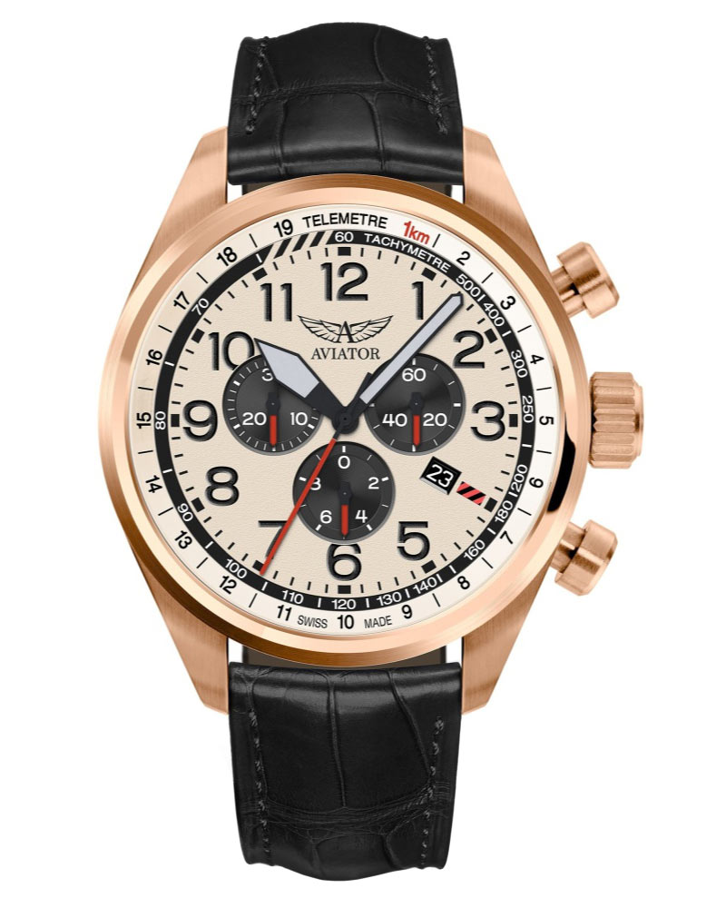 Aviator Airacobra P45 Chrono V22521734 je 45mm PVD růžové zlato kartáčované nerezové kulaté pouzdro z utěsněné na 100 metrů. Na pravé straně pouzdra je šroubovací korunka, velká a snadno ovladatelná a funkční tlačítka. K uším je připevněn elegantní černý kožený řemínek s exotickým vzorem a zapínáním na přezku. Spona je vyrobena tak, že odkazuje na aerodynamická letadla. Safírové sklíčko s antireflexem, vysoce odolné proti poškrábání, chrání zářivý kontrastní ciferník s velkými ručičkami a arabskými číslicemi, které jsou překryty svítícím luma, což umožňuje snadné odečítání času i ve tmě. Na 4. hodinu výrobce umístil datumové okénko s aktuálním dnem v měsíci. Hodinky jsou vybaveny více funkcemi - chronografem, jinak známým jako stopky, tachymetrem a telemetrem. Chronograf vám umožní měřit přesný čas například kol v různých typech závodů. Tachymetr bude měřit průměrnou rychlost pohybu na vzdálenost jednoho kilometru. Funkce telemetru hodinek se obvykle používá k měření vzdálenosti mezi nositelem hodinek a jevem, který je pozorován a slyšen současně, jako je exploze nebo blesk. Telemetr má svou stupnici umístěnou na lunetě hodinek. V hodinkách bije quartzové srdce na baterie - Ronda 5040D je švýcarský Machineek a zajistí přesné měření času.