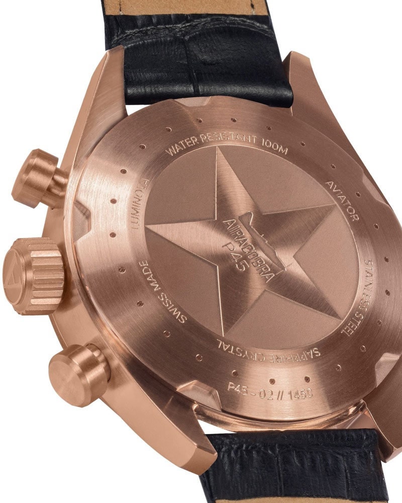 Na zadní straně hodinek se nachází šroubovací záda pouzdra a stejně jako v případě korunky posiluje těsnost hodinek. Najdeme na něm jemné popisy odkazující na konstrukci trupu letounu Airacobra. Zadní stranu pouzdra zdobí také hvězda a v jejím středu je rovina, která si zaslouží pár okamžiků pozornosti. Tato stíhačka je americká stíhačka Bell Airacobra P-39, jejímž výrobcem byl Bell Aircraft z období 2. světové války. Jeho první let se uskutečnil 6. dubna 1938 a Originně byl zamýšlen jako doprovodný letoun pro bombardéry, ale nakonec výrobce změnil jeho roli na útočnou stíhačku.