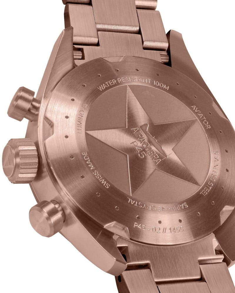 Na zadní straně hodinek se nachází šroubovací záda pouzdra a stejně jako v případě korunky posiluje těsnost hodinek. Najdeme na něm jemné popisy odkazující na konstrukci trupu letounu Airacobra. Zadní stranu pouzdra zdobí také hvězda a v jejím středu je rovina, která si zaslouží pár okamžiků pozornosti. Tato stíhačka je americká stíhačka Bell Airacobra P-39, jejímž výrobcem byl Bell Aircraft z období 2. světové války. Jeho první let se uskutečnil 6. dubna 1938 a Originně byl zamýšlen jako doprovodný letoun pro bombardéry, ale nakonec výrobce změnil jeho roli na útočnou stíhačku.