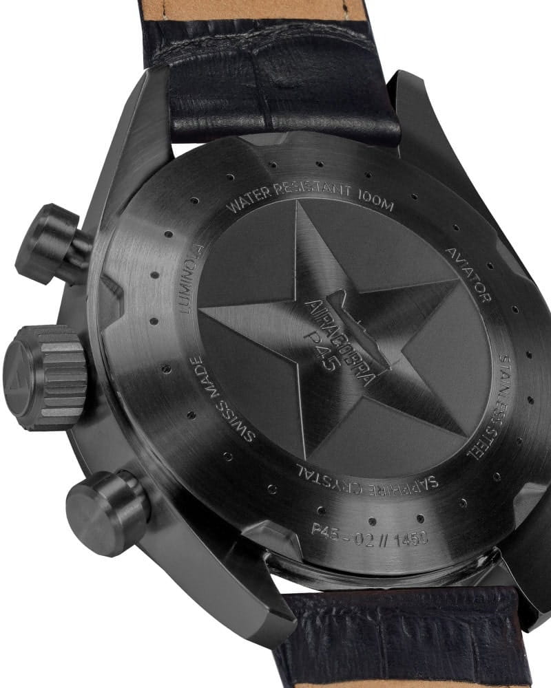 Na zadní straně hodinek se nachází šroubovací záda pouzdra a stejně jako v případě korunky posiluje těsnost hodinek. Najdeme na něm jemné popisy odkazující na konstrukci trupu letounu Airacobra. Zadní stranu pouzdra zdobí také hvězda a v jejím středu je rovina, která si zaslouží pár okamžiků pozornosti. Tato stíhačka je americká stíhačka Bell Airacobra P-39, jejímž výrobcem byl Bell Aircraft z období 2. světové války. Jeho první let se uskutečnil 6. dubna 1938 a Originně byl zamýšlen jako doprovodný letoun pro bombardéry, ale nakonec výrobce změnil jeho roli na útočnou stíhačku.
