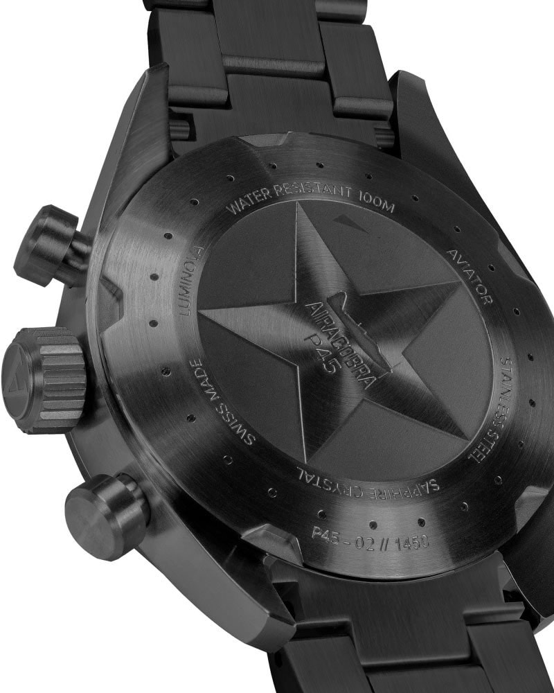 Na zadní straně hodinek se nachází šroubovací záda pouzdra a stejně jako v případě korunky posiluje těsnost hodinek. Najdeme na něm jemné popisy odkazující na konstrukci trupu letounu Airacobra. Zadní stranu pouzdra zdobí také hvězda a v jejím středu je rovina, která si zaslouží pár okamžiků pozornosti. Tato stíhačka je americká stíhačka Bell Airacobra P-39, jejímž výrobcem byl Bell Aircraft z období 2. světové války. Jeho první let se uskutečnil 6. dubna 1938 a Originně byl zamýšlen jako doprovodný letoun pro bombardéry, ale nakonec výrobce změnil jeho roli na útočnou stíhačku.