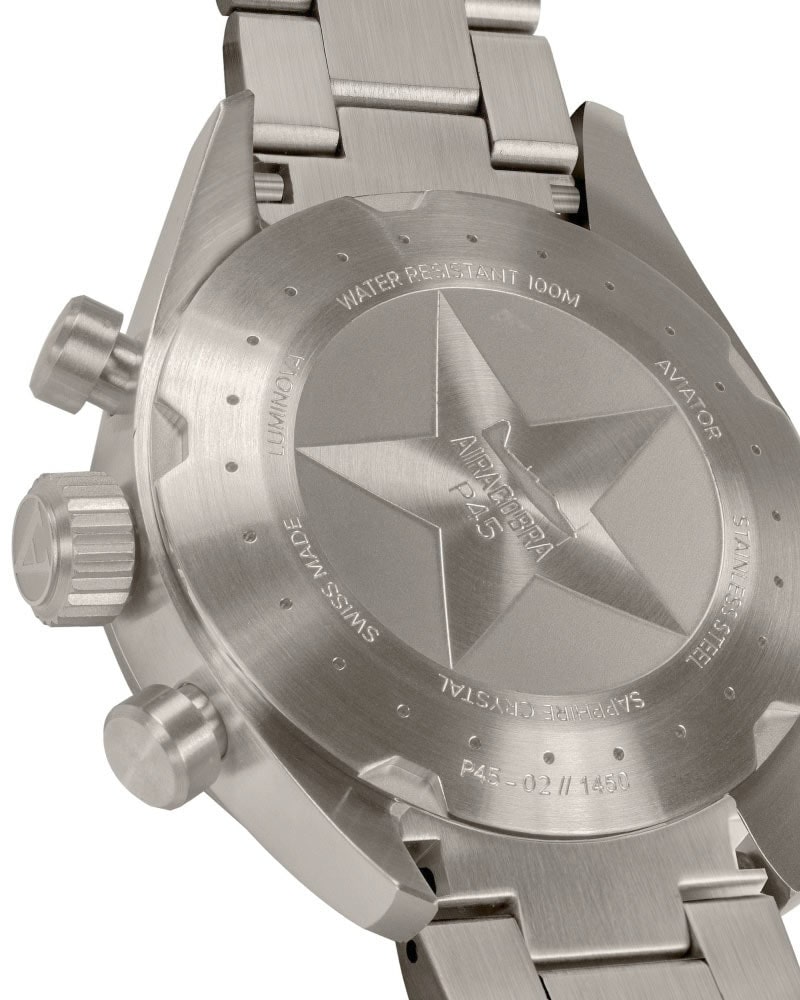 Na zadní straně hodinek se nachází šroubovací záda pouzdra a stejně jako v případě korunky posiluje těsnost hodinek. Najdeme na něm jemné popisy odkazující na konstrukci trupu letounu Airacobra. Zadní stranu pouzdra zdobí také hvězda a v jejím středu je rovina, která si zaslouží pár okamžiků pozornosti. Tato stíhačka je americká stíhačka Bell Airacobra P-39, jejímž výrobcem byl Bell Aircraft z období 2. světové války. Jeho první let se uskutečnil 6. dubna 1938 a Originně byl zamýšlen jako doprovodný letoun pro bombardéry, ale nakonec výrobce změnil jeho roli na útočnou stíhačku.