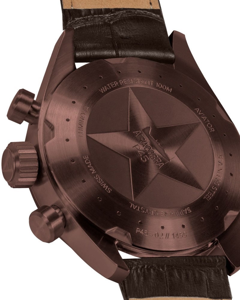 Na zadní straně hodinek se nachází šroubovací záda pouzdra a stejně jako v případě korunky posiluje těsnost hodinek. Najdeme na něm jemné popisy odkazující na konstrukci trupu letounu Airacobra. Zadní stranu pouzdra zdobí také hvězda a v jejím středu je rovina, která si zaslouží pár okamžiků pozornosti. Tato stíhačka je americká stíhačka Bell Airacobra P-39, jejímž výrobcem byl Bell Aircraft z období 2. světové války. Jeho první let se uskutečnil 6. dubna 1938 a Originně byl zamýšlen jako doprovodný letoun pro bombardéry, ale nakonec výrobce změnil jeho roli na útočnou stíhačku.