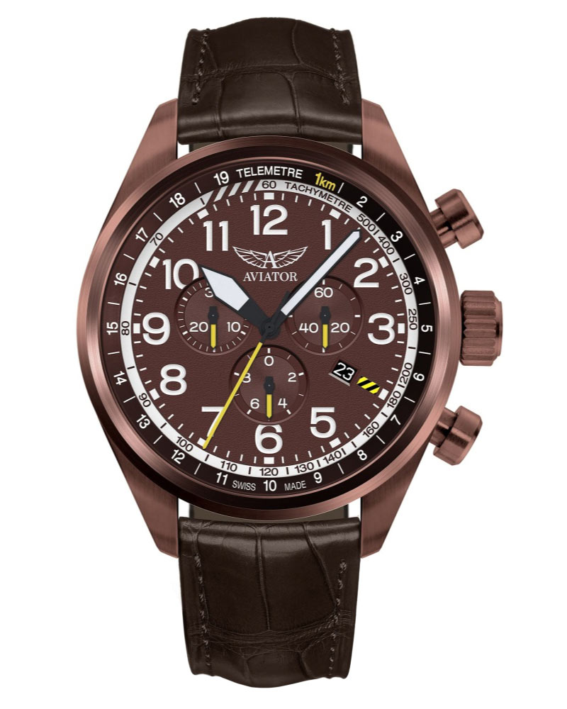 Aviator Airacobra P45 Chrono V22581724 je 45mm kulaté kartáčované PVD bronzové pouzdro z nerezové oceli utěsněné na 100 metrů. Na pravé straně pouzdra je šroubovací korunka, velká a snadno ovladatelná a funkční tlačítka. Na ouška je připevněn elegantní hnědý kožený řemínek s exotickým vzorem a zapínáním na přezku. Spona je vyrobena tak, že odkazuje na aerodynamická letadla. Safírové sklíčko vysoce odolné proti poškrábání s antireflexní ochranou chrání hnědý kontrastní ciferník s velkými ručičkami a arabskými číslicemi, které jsou překryty svítící lumou, která umožňuje snadné odečítání času i ve tmě. Na 4. hodinu výrobce umístil datumové okénko s aktuálním dnem v měsíci. Hodinky jsou vybaveny více funkcemi - chronografem, jinak známým jako stopky, tachymetrem a telemetrem. Chronograf vám umožní měřit přesný čas například kol v různých typech závodů. Tachymetr bude měřit průměrnou rychlost pohybu na vzdálenost jednoho kilometru. Funkce telemetru hodinek se obvykle používá k měření vzdálenosti mezi nositelem hodinek a jevem, který je pozorován a slyšen současně, jako je exploze nebo blesk. Telemetr má svou stupnici umístěnou na lunetě hodinek. V hodinkách bije quartzové srdce na baterie - Ronda 5040D je švýcarský Machineek a zajistí přesné měření času.