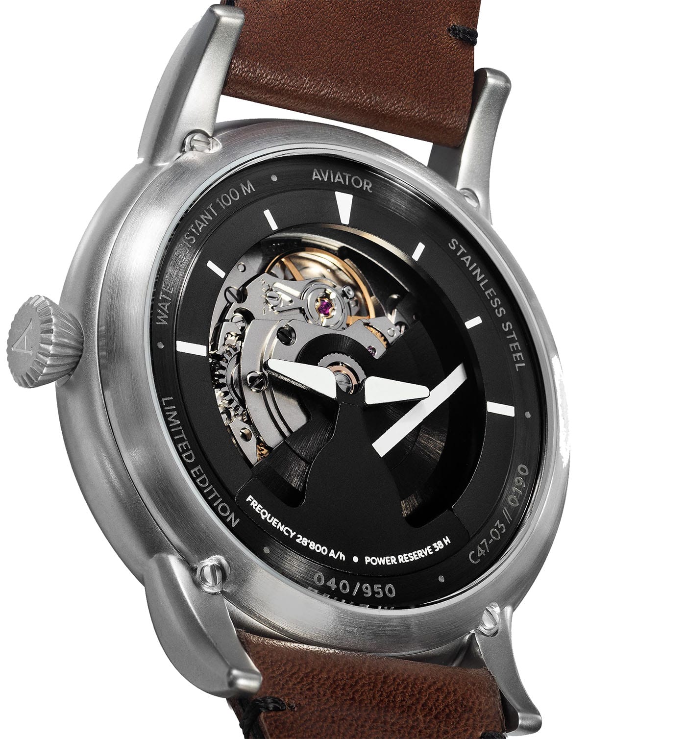 Řemínek Aviator, vyrobený z pravé kůže a za použití nejlepších technik, byl speciálně vyvinut tak, aby ctil ducha a dobrodružství létání. Na velkých pánských hodinkách z kolekce Dakota nabízí bezešvý řemínek čistý a minimalistický obličej, který připomíná pozdější léta Art Deco. Řemínek se také skládá ze tří různých částí: přední část v retro stylu vyrobená z nejměkčí lícové kůže, střední vrstva, která poskytuje pevnou oporu, a zadní povrch z měkké kůže pro extra pohodlí v ruce.