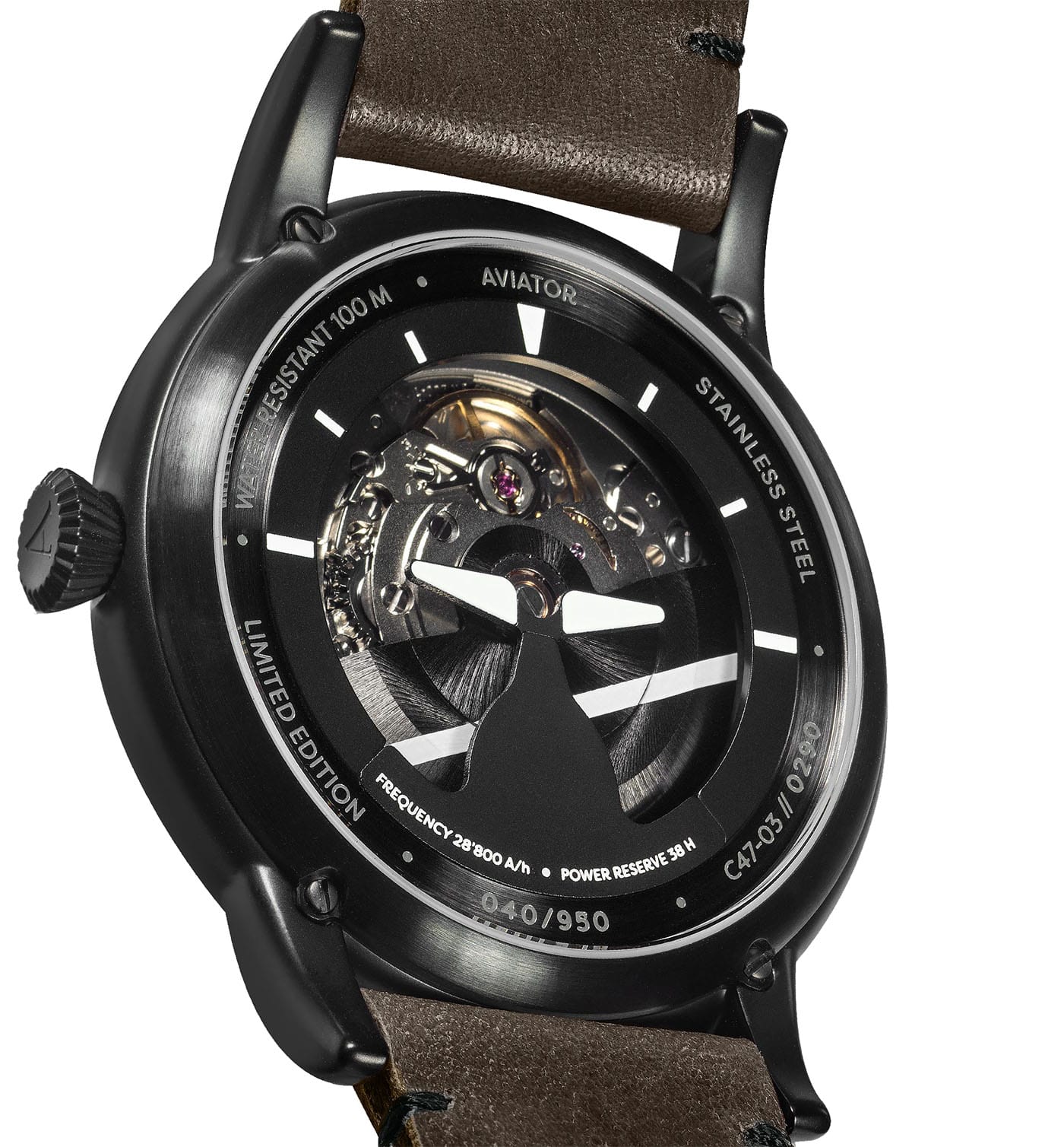 Víko je vybaveno ukazatelem polohy v kokpitu Douglas Dakota a odráží funkci, která měří orientaci letadla vzhledem k zemskému horizontu. Tato funkce je pokryta krystalem, který chrání jemnou mechaniku před poškrábáním a otřesy a poskytuje pohodlí zápěstí. Jak detaily, které kopírují letecké dědictví, tak jemné hodinářské techniky, jako je tato funkce, jsou vštípeny do každého modelu Aviator.