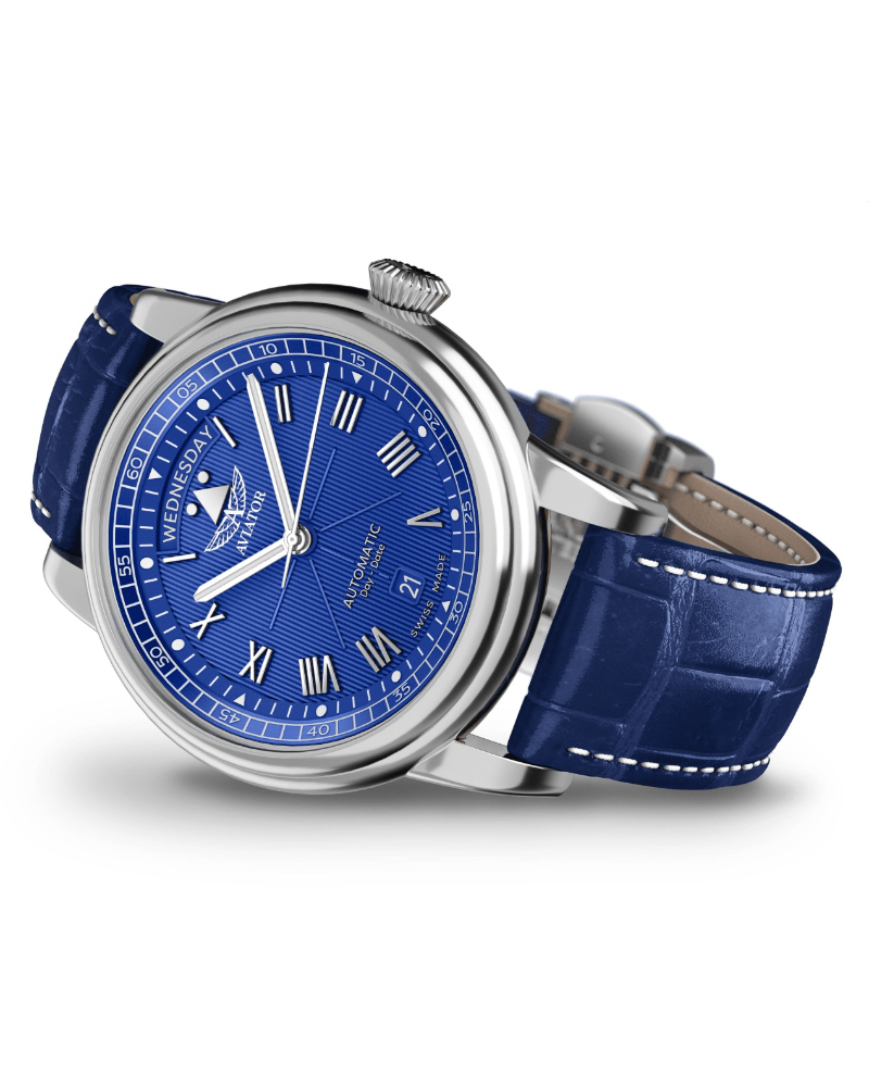 Srdcem těchto hodinek je nejnovější kalibr AV-1000 vyvinutý společností AVIATOR. Vychází z nejznámějšího švýcarského mechanického Machineku Sellita SW 240-1. Kalibr AV-1000 byl vyroben kombinací pokročilé technologie a estetiky. S funkčností v jádru tento pohyb zahrnuje ukazatele dne v týdnu a data. Systém Incabloc chrání mechanismus proti otřesům a nárazům. Mezitím se nadrozměrný a nádherně zpracovaný rotor hladce přizpůsobí designu číselníku, aby si zachoval styl Art Deco na přední i zadní straně hodinek.