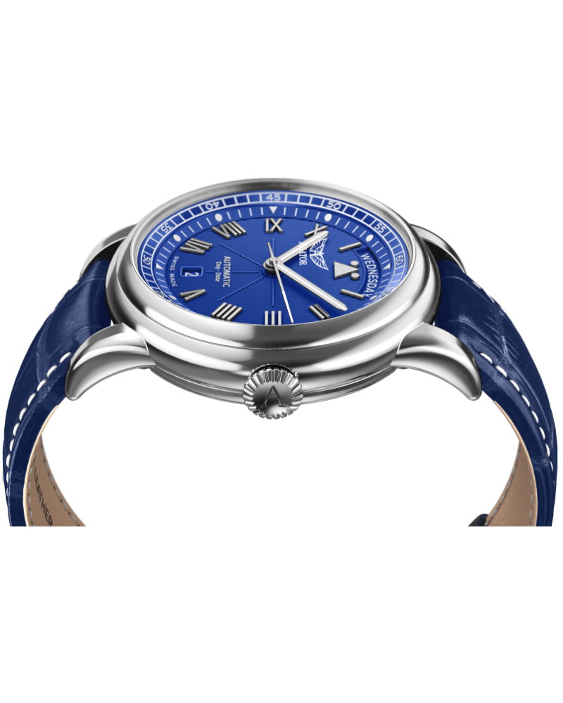 Ciferník hodinek AVIATOR Douglas Day Date 41 se vyznačuje jemným 3D vzorem s volumetrickým značením a elegantně zakřiveným okénkem pro označení aktuálního dne. Vzhledem k tomu, že neomezená viditelnost a čitelnost jsou základními atributy, kolekce Douglas Day Date 41 spojuje design a funkčnost ve stylu Art Deco. Od odvážných, umně leštěných římských číslic až po dva vyvýšené prstence příMachineů se světelnými indexy inspirovanými počítadly v kokpitu. Design číselníku s hlubokými a jemnými drážkami odráží barevné odlesky připomínající metalický hedvábný efekt a symbolizuje nadčasovou sofistikovanost.