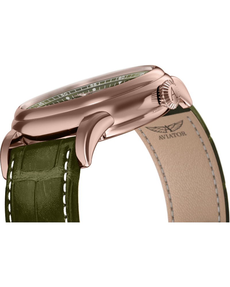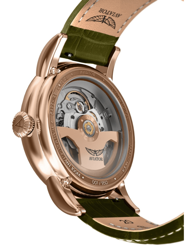 Srdcem těchto hodinek je nejnovější kalibr AV-1000 vyvinutý společností AVIATOR. Vychází z nejznámějšího švýcarského mechanického Machineku Sellita SW 240-1. Kalibr AV-1000 byl vyroben kombinací pokročilé technologie a estetiky. S funkčností v jádru tento pohyb zahrnuje ukazatele dne v týdnu a data. Systém Incabloc chrání mechanismus proti otřesům a nárazům. Mezitím se nadrozměrný a nádherně zpracovaný rotor hladce přizpůsobí designu číselníku, aby si zachoval styl Art Deco na přední i zadní straně hodinek.