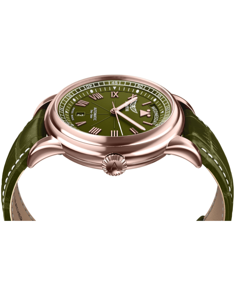 Ciferník hodinek AVIATOR Douglas Day Date 41 se vyznačuje jemným 3D vzorem s volumetrickým značením a elegantně zakřiveným okénkem pro označení aktuálního dne. Vzhledem k tomu, že neomezená viditelnost a čitelnost jsou základními atributy, kolekce Douglas Day Date 41 spojuje design a funkčnost ve stylu Art Deco. Od odvážných, umně leštěných římských číslic až po dva vyvýšené prstence příMachineů se světelnými indexy inspirovanými počítadly v kokpitu. S hlubokými a jemnými drážkami odráží design číselníku barevné odlesky připomínající metalický hedvábný efekt a symbolizuje nadčasovou sofistikovanost.
