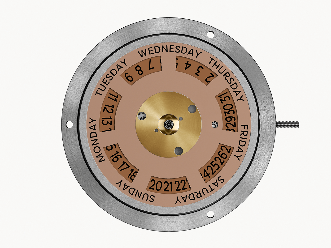 Střed zlatého ciferníku s trojrozměrnou strukturou odkazuje na hvězdicový motor. Obrobený vzor odráží pístní kroužky a jejich drážky. Otevřený displej dne v týdnu a otočné voliče odkazují na mechaniku motoru. Autentické navigační symboly zlepšují čitelnost. Ručičky ve tvaru katedrály vyplněné materiálem Luminova X1 Top Grade poskytují až 65% zvýšení účinnosti - norma ISO 3157. Kovové arabské číslice jsou osazeny na safírovém sklíčku s dvojitým antireflexem.