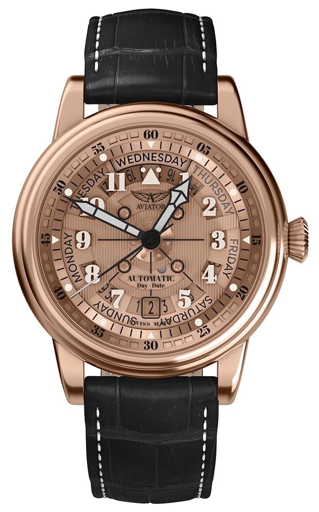 Letecké hodinky Douglas Day-Date Meca-41 s datem a dnem v týdnu mají víceúrovňový ciferník integrovaný do Machineku (ráže AV-1000, základna - Sellita SW-240). Jeho design byl inspirován aerodynamikou, ergonomií a luxusem největšího letadla zlatého věku letectví - Douglas DC-3. Přesný počet úrovní štítu je 8 a skládá se ze 2 úrovní prstenů a 6 úrovní štítů. Taková bezchybná a sofistikovaná montáž v pozlacených pánských leteckých hodinkách Aviator nabízí ohromující a skutečný 3D hloubkový efekt.