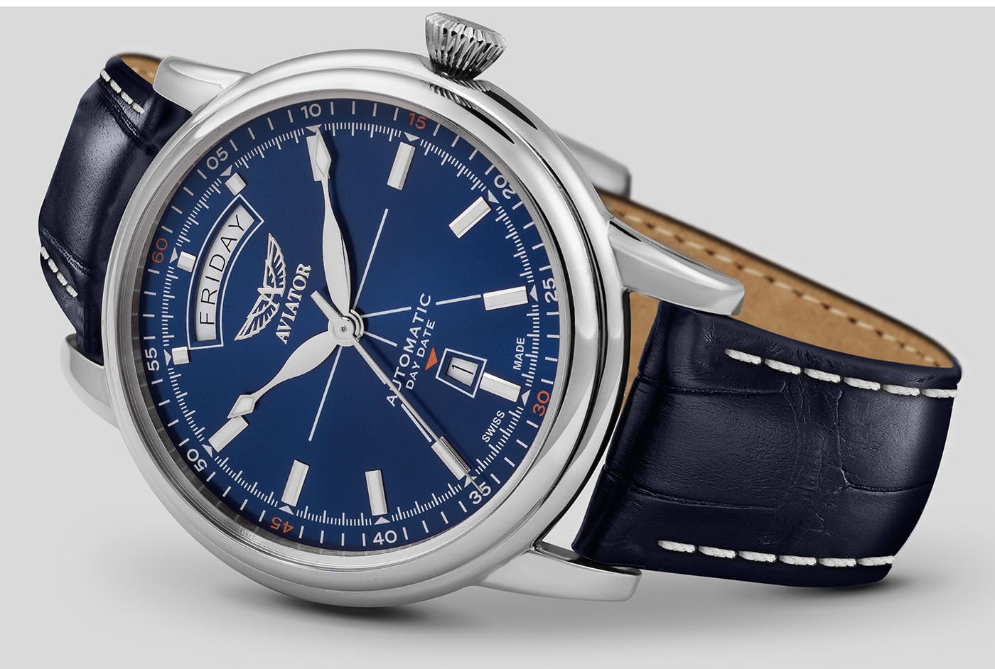 Pilotní hodinky Aviator Douglas Day-Date mají matný ciferník, elegantně zakřivené denní okénko a lichoběžníkové okénko kalendáře. Vzhledem k tomu, že čitelnost a viditelnost jsou pro pilota základními atributy, kolekce Douglas Day-Date nabízí leštěné kovové indexy a ručičky vyplněné SuperLuminova. Dekorativní, jemné akcenty na rukou byly inspirovány kokpitem. Celek byl pokryt dokonale průhledným safírovým sklem odolným proti poškrábání a oslnění.