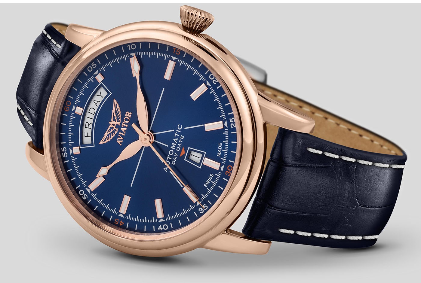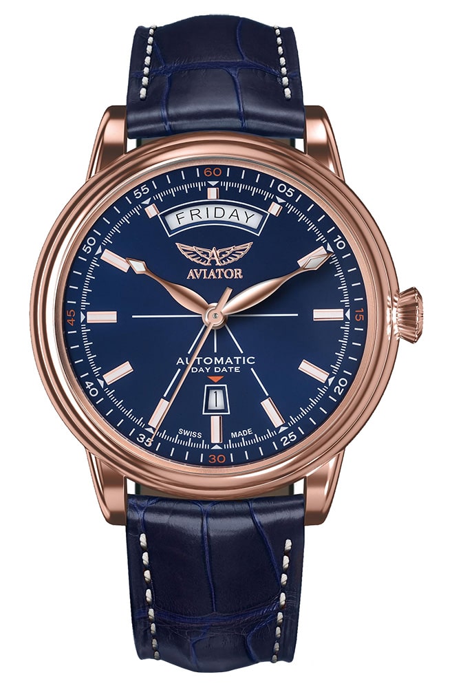 Pozlacené hodinky Aviator Douglas Day-Date V.3.20.2.225.4 inspirované revolučním letounem Douglas DC-3. Toto letadlo přepravovalo cestující první třídy a ukázalo se, že je klíčové pro zlatý věk letectví. Kombinací funkce nastavení data se složitým vzorem Art Deco na číselníku vzdává Aviator Day-Date hold luxusnímu cestování a jednomu z největších letadel historie.