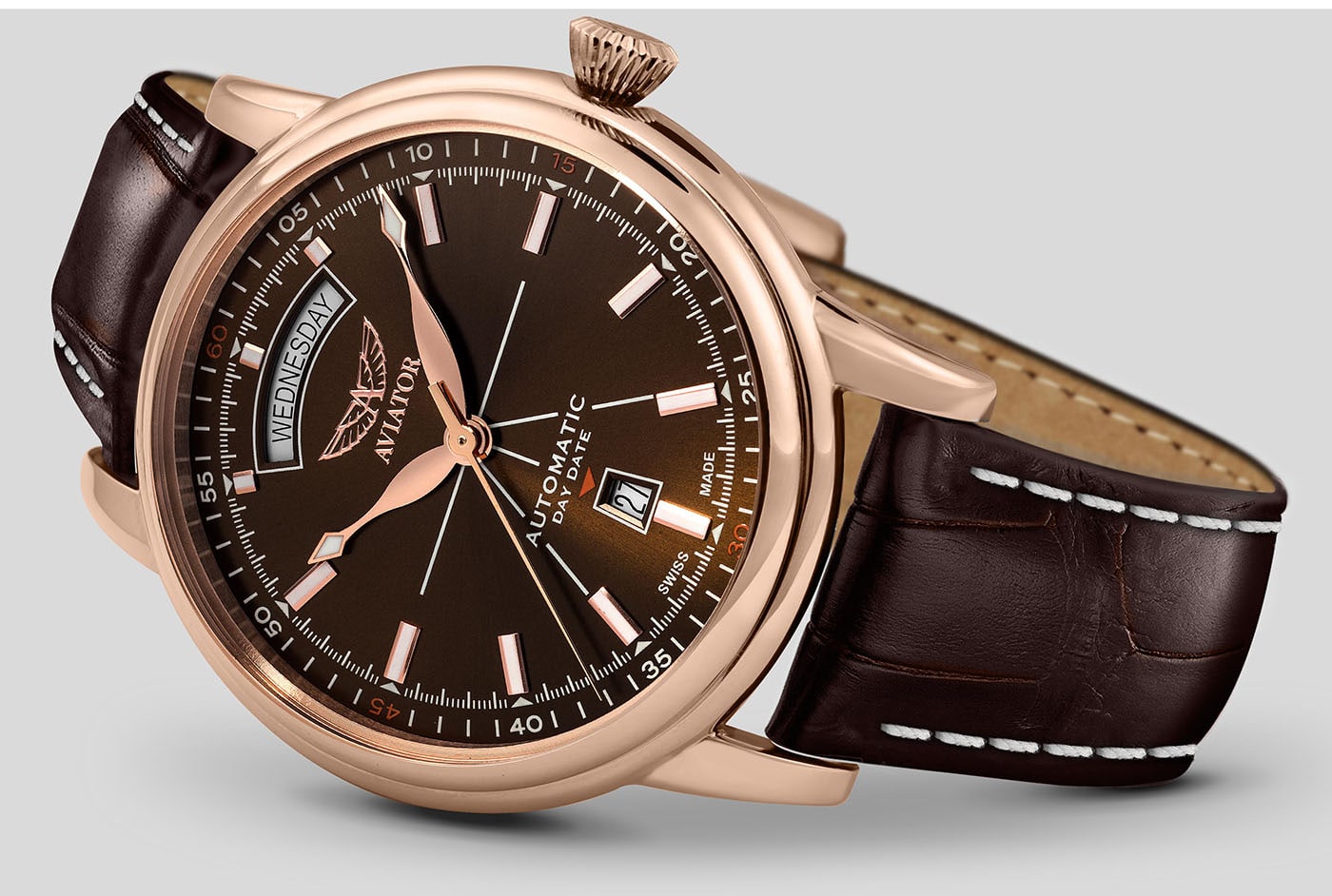 Pozlacené hodinky Aviator Douglas Day-Date V.3.20.2.226.4 inspirované revolučním letounem Douglas DC-3. Toto letadlo přepravovalo cestující první třídy a ukázalo se, že je klíčové pro zlatý věk letectví. Kombinací funkce nastavení data se složitým vzorem Art Deco na číselníku vzdává Aviator Day-Date hold luxusnímu cestování a jednomu z největších letadel historie.