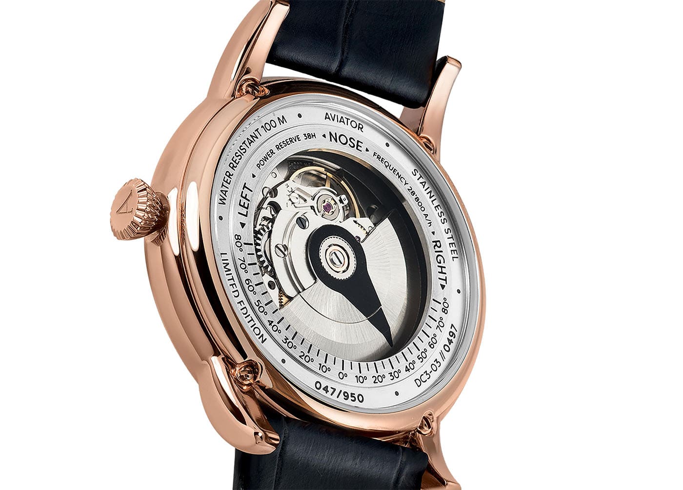 Pozlacený Aviator Douglas DC-3 se vyznačuje intenzivně třpytivým povrchem s číselníkem se vzorem Sunrise v kombinaci se zapuštěným rámečkem a jemnými, koncentrovanými kruhy. Protože čitelnost a viditelnost jsou pro pilota základními atributy, kolekce Douglas DC3 nabízí leštěné, pozlacené indexy a ručičky naplněné SuperLuminova. Dekorativní, jemné akcenty na rukou byly inspirovány kokpitem. Celek byl pokryt dokonale průhledným safírovým sklem odolným proti poškrábání a oslnění.