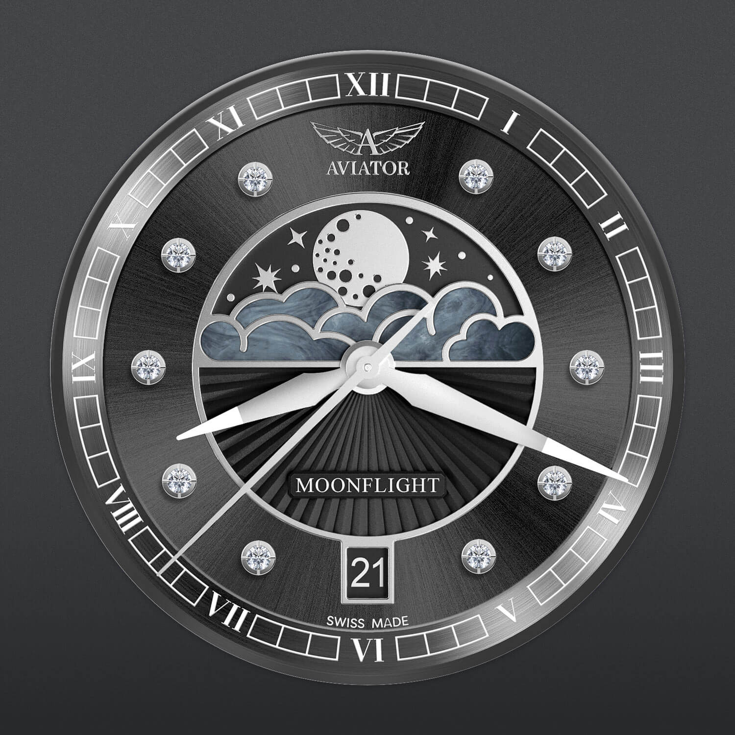 Střed ciferníku zdobí poetická komplikace měsíční fáze, ukrytá pod jemnými obláčky z perleti – prvek, který nejen okouzluje, ale symbolicky odkazuje na ženskou proměnlivost, tajemství a harmonii s přírodním cyklem. Třpytivé odlesky a hluboký purpur ciferníku vytvářejí hru světla a barev, která přitahuje pohledy a zastavuje čas – na zápěstí i v myšlenkách. Hodinky Aviator umožňují sledovat 29.5 denní lunární cyklus a připomínají, že život není jen o minutách a hodinách, ale také o fázích, proměnách a náladách.