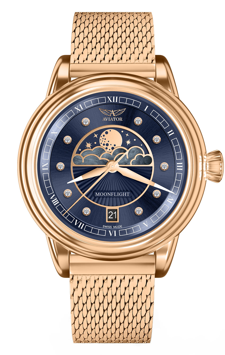 Střed číselníku zdobí poetická komplikace měsíčních fází, ukrytá pod jemnými obláčky z perleti – prvek, který nejen okouzluje, ale symbolicky odkazuje na ženskou proměnlivost, tajemství a harmonii s cyklem přírody. Třpytivé odlesky a hluboká purpura číselníku vytvářejí světelnou a barevnou podívanou, která přitahuje pohledy a zastavuje čas – na zápěstí i v mysli. Hodinky Aviator umožňují sledovat 29,5denní lunární cyklus, připomínající, že život nejsou jen minuty a hodiny, ale také fáze, změny, nálady.