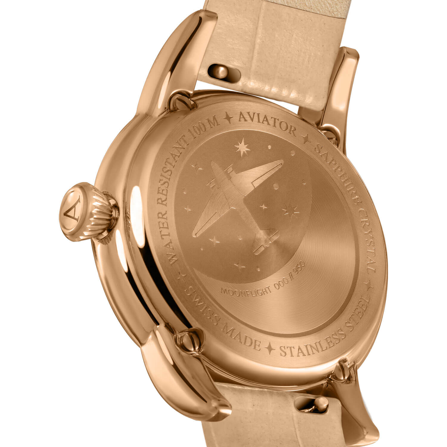 Švýcarské hodinky Aviator Limited Edition zaujmou navenek pozlaceným 36mm pouzdrem s ručně leštěnými křivkami a třídílnou konstrukcí inspirovanou trupem letadla. Pohodlná zakřivená ramena růžově zlatého pouzdra a vypouklé sklo tvoří harmonický celek – smyslný a aerodynamický, dokonale padnoucí na ženské zápěstí. Přední stranu chrání safírové sklo s antireflexní vrstvou, které je velmi odolné proti poškrábání. Na zadní straně je vygravírován letoun Douglas DC-3 v měsíčním svitu – detail, který spojuje sen o cestování s luxusem každodenního života. Tato elegance je postavena na příběhu, zpracování a emocích – ne na sezónní módě. Prezentovaný model je doplněn měkkým a lehkým koženým řemínkem v krémově béžové barvě, který perfektně ladí s pozlaceným ciferníkem.