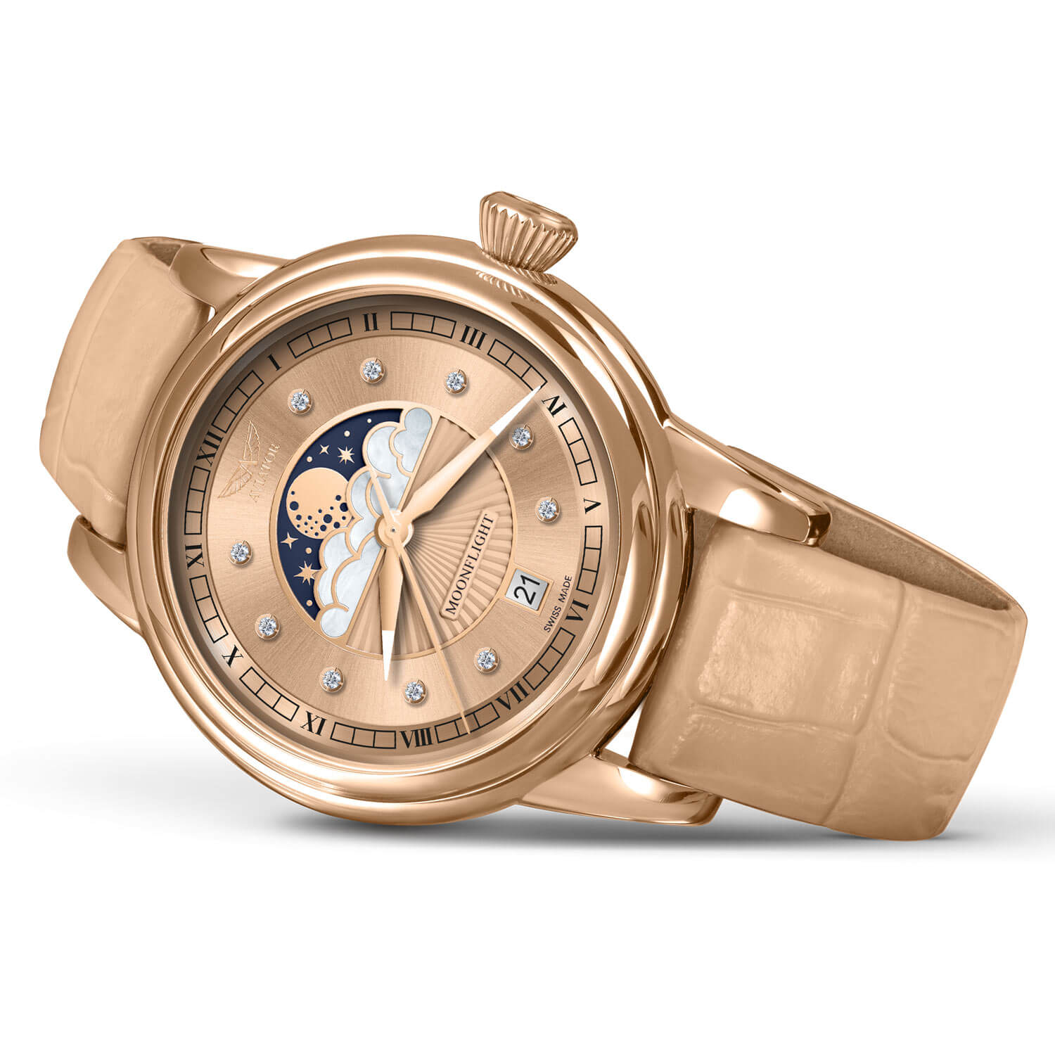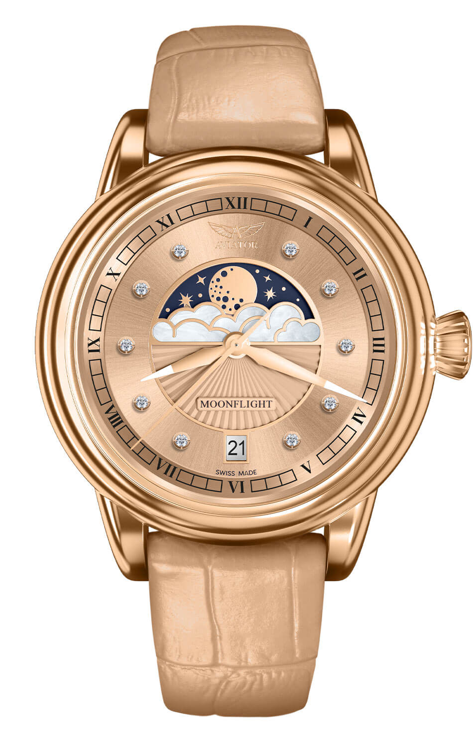 Střed ciferníku zdobí poetická komplikace měsíční fáze, ukrytá pod jemnými obláčky z perleti – prvek, který nejen okouzluje, ale symbolicky odkazuje na ženskou proměnlivost, tajemství a harmonii s přírodními cykly. Třpytivé odlesky a hluboký purpur ciferníku vytvářejí hru světla a barev, která přitahuje pohledy a zastavuje čas – na zápěstí i v myšlenkách. Hodinky Aviator umožňují sledovat 29,5denní lunární cyklus a připomínají, že život není jen o minutách a hodinách, ale také o fázích, proměnách a náladách.