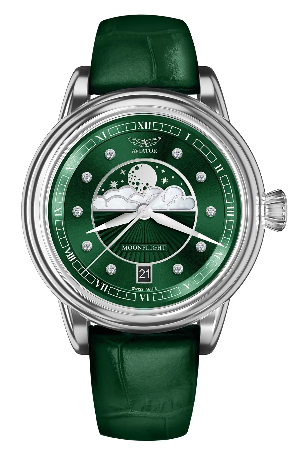 Limitované dámské hodinky Aviator Douglas Moonflight Diamond Polska Edycja V.1.33.0.390.4 PL jsou výjimečnou edicí kultovního modelu Moonflight, připravenou speciálně pro polské milovníky hodinářského umění. Limitovaná edice na 100 kusů představuje spojení elegance, leteckého dědictví a klenotnického mistrovství. Model v odstínu hluboké zeleně, symbolizující rovnováhu a sílu přírody, okouzluje jemným třpytem diamantů použitých jako indexy. Jsou to hodinky pro ženy, které hledají jedinečný způsob sebevyjádření – propojení tradice, luxusu a symboliky polské edice.