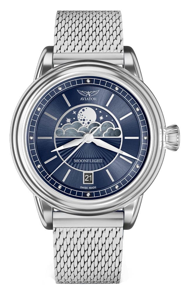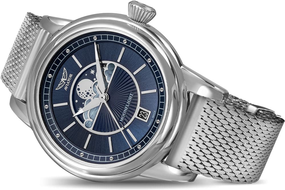 Extrémně tvrdé a proti poškrábání odolné safírové sklíčko s antireflexem chrání ciferník s jemnými ocelovými indexy a ručičkami. Ty jsou vybaveny luminiscenčním materiálem, který vám pomůže odečíst aktuální čas ve tmě. Ciferník zdobí giloš v podobě slunečních paprsků a je vybaven subčíselníkem fáze měsíce. Jedinečný číselník fáze měsíce obsahuje mraky zasazené do jedinečného perleťového rámu, hvězdnou oblohu a zářící měsíc ve všech svých fázích. Funkce fáze měsíce je nejen krásnou ozdobou pro ženské oko, ale také užitečným mechanismem pro pozorování Měsíce bez pohledu z okna. Celý číselník je navržen s 3D vnímáním hloubky. Pod ním je vysoce přesný švýcarský Machineek na baterie. Kromě sledování času poskytuje informace o měsíčních fázích a datu, které si našlo své místo na 6. hodině.Tento dámský letecký časovač Aviator se síťovaným náramkem bude perfektním partnerem do kabelek, elegantních kostýmů a šperky doplňky.