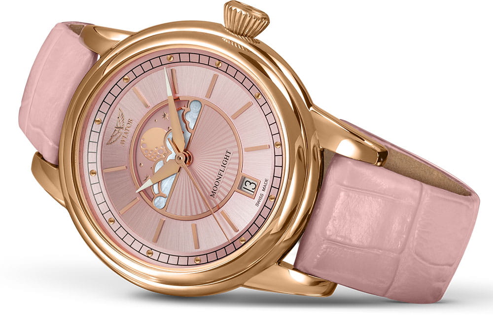 Extrémně tvrdé a proti poškrábání odolné safírové sklo s antireflexem chrání růžový ciferník s jemnými ocelovými indexy a ostrými ručičkami. Ručičky jsou vybaveny svítící lumou, která vám pomůže odečíst aktuální čas v naprosté tmě. Ciferník je zdoben gilošovaným vzorem v podobě slunečních paprsků a opatřen sytě barevným subčíselníkem funkce měsíční fáze. Jedinečný číselník fáze měsíce obsahuje mraky zasazené do jedinečného perleťového rámu, hvězdnou oblohu a jiskřivý měsíc ve všech jeho fázích. Funkce fáze měsíce je nejen krásnou ozdobou pro ženské oko, ale také užitečným mechanismem pro pozorování Měsíce bez pohledu z okna. Celý ciferník je navržen ve stylu Art Deco s trojrozměrným vnímáním hloubky. Módní barvy hodinek jistě budou slušet něžnému pohlaví. Hodinky budou perfektním partnerem pro kabelky, elegantní kostýmy a bižuterní doplňky.