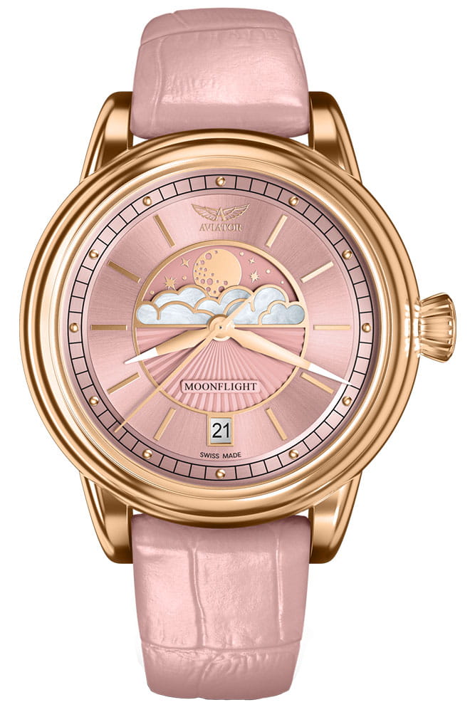 Ve 30. letech 20. století poskytoval každý let legendárního letadla Douglas DC-3 atmosféru elegance a luxusu, která se v dnešních vysokorychlostních komerčních letech nenachází. V každém aspektu dal Douglas DC-3 světu lepší pohled na cestování a definoval tak zlatý věk letectví – dámské hodinky Aviator V13302584 z kolekce Moonflight jsou odkazem na tyto časy a zážitky.