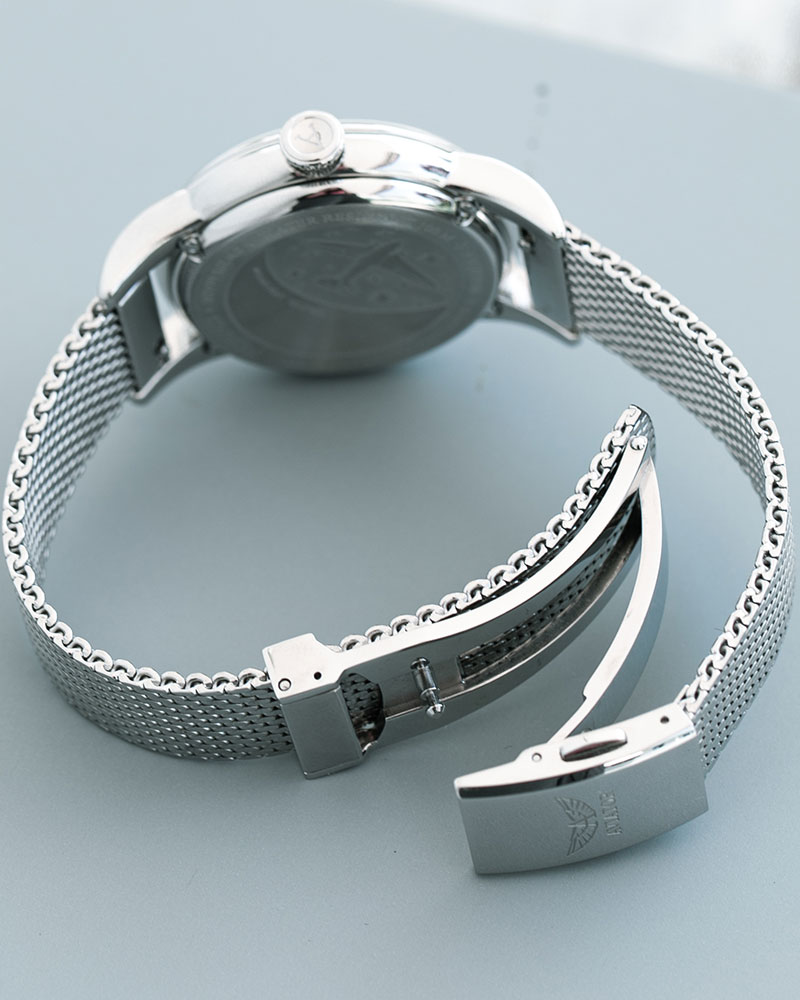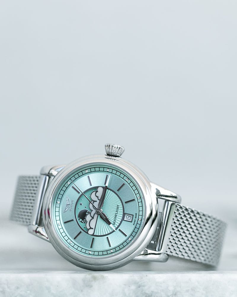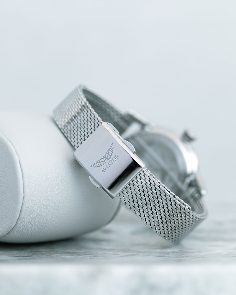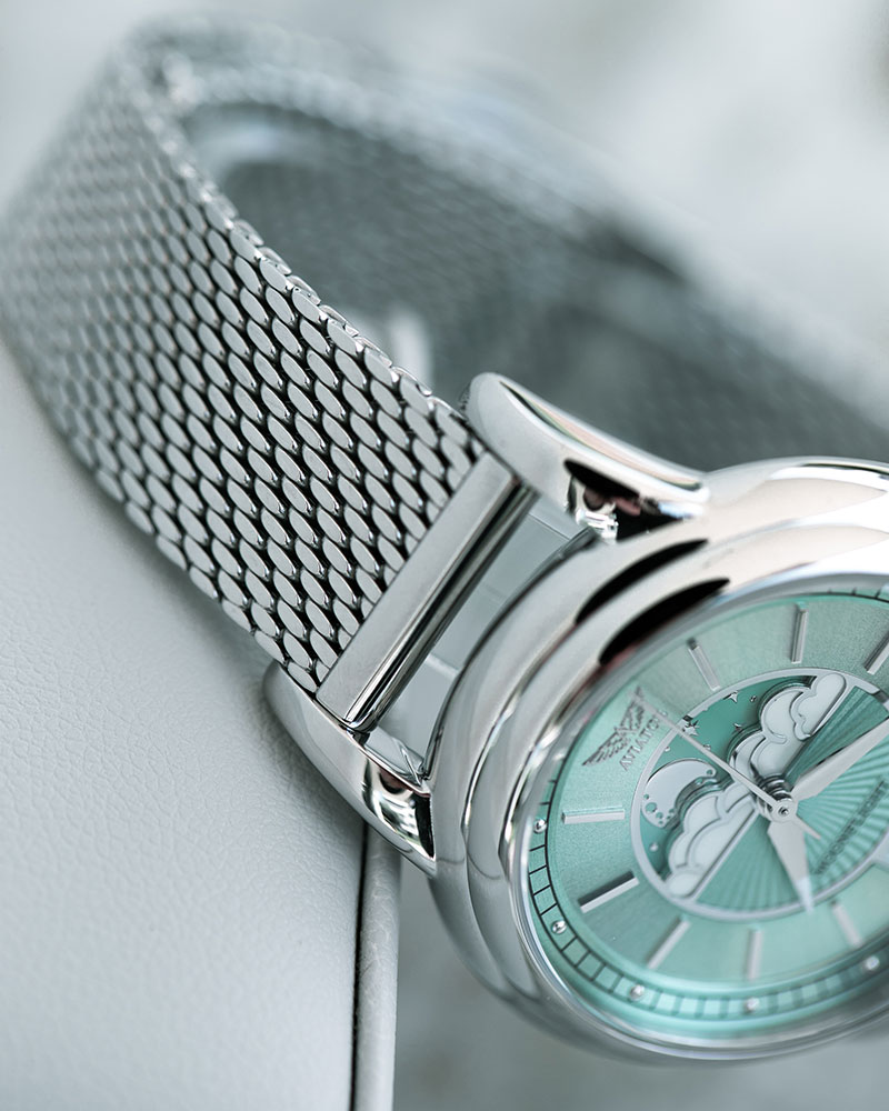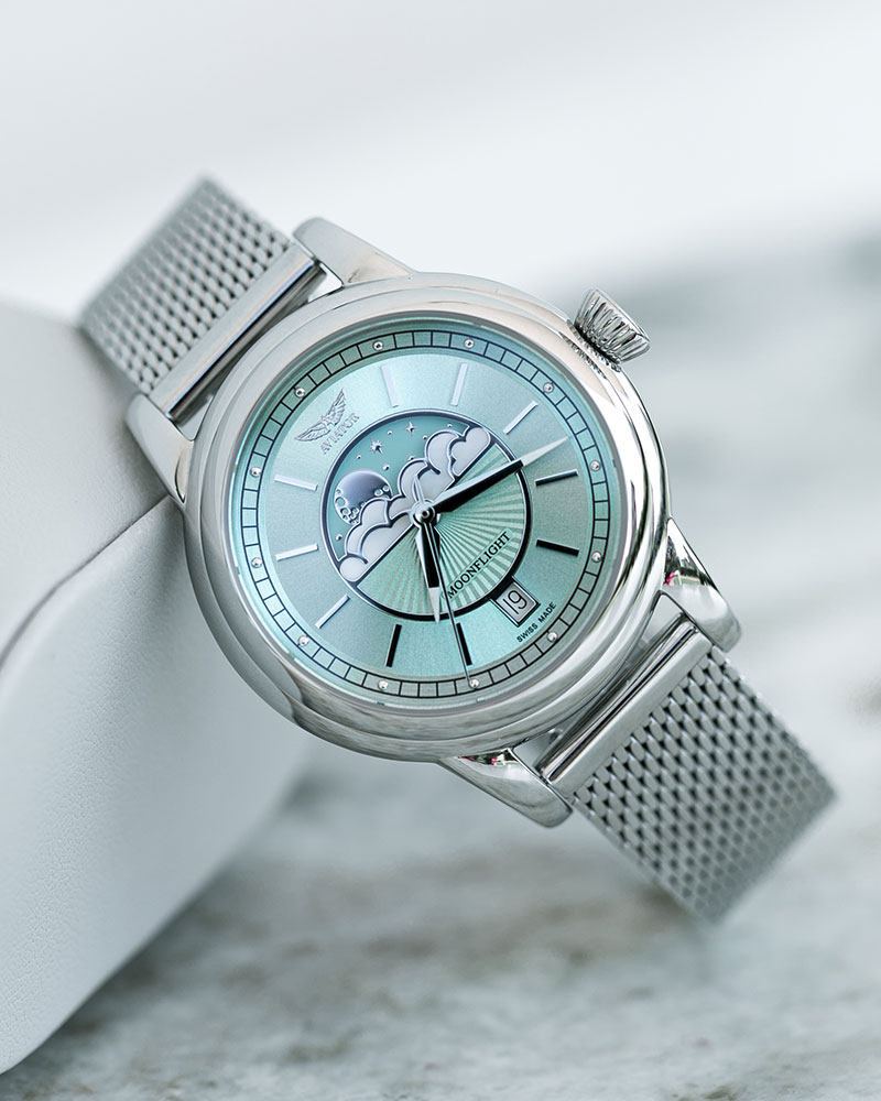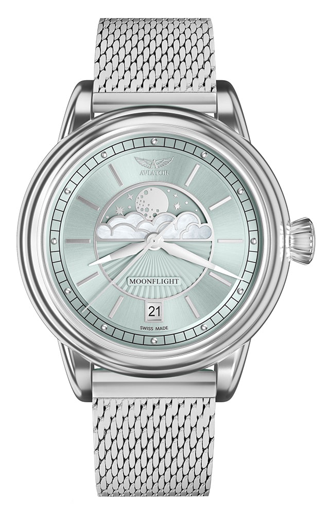 Extrémně tvrdé a proti poškrábání odolné safírové sklíčko s antireflexem chrání ciferník s jemnými ocelovými indexy a ručičkami. Ty jsou vybaveny luminiscenčním materiálem, který vám pomůže odečíst aktuální čas ve tmě. Ciferník zdobí giloš v podobě slunečních paprsků a je vybaven subčíselníkem fáze měsíce. Jedinečný číselník fáze měsíce obsahuje mraky zasazené do jedinečného perleťového rámu, hvězdnou oblohu a zářící měsíc ve všech svých fázích. Funkce fáze měsíce je nejen krásnou ozdobou pro ženské oko, ale také užitečným mechanismem pro pozorování Měsíce bez pohledu z okna. Celý číselník je navržen s 3D vnímáním hloubky. Pod ním je vysoce přesný švýcarský Machineek na baterie. Kromě měření času poskytuje informace o měsíčních fázích a datu, které si našlo své místo na 6. hodině.Tyto stříbrné dámské hodinky Aviator na síťovaném náramku budou perfektním partnerem do kabelky, elegantního kostýmku i šperky doplňky.
