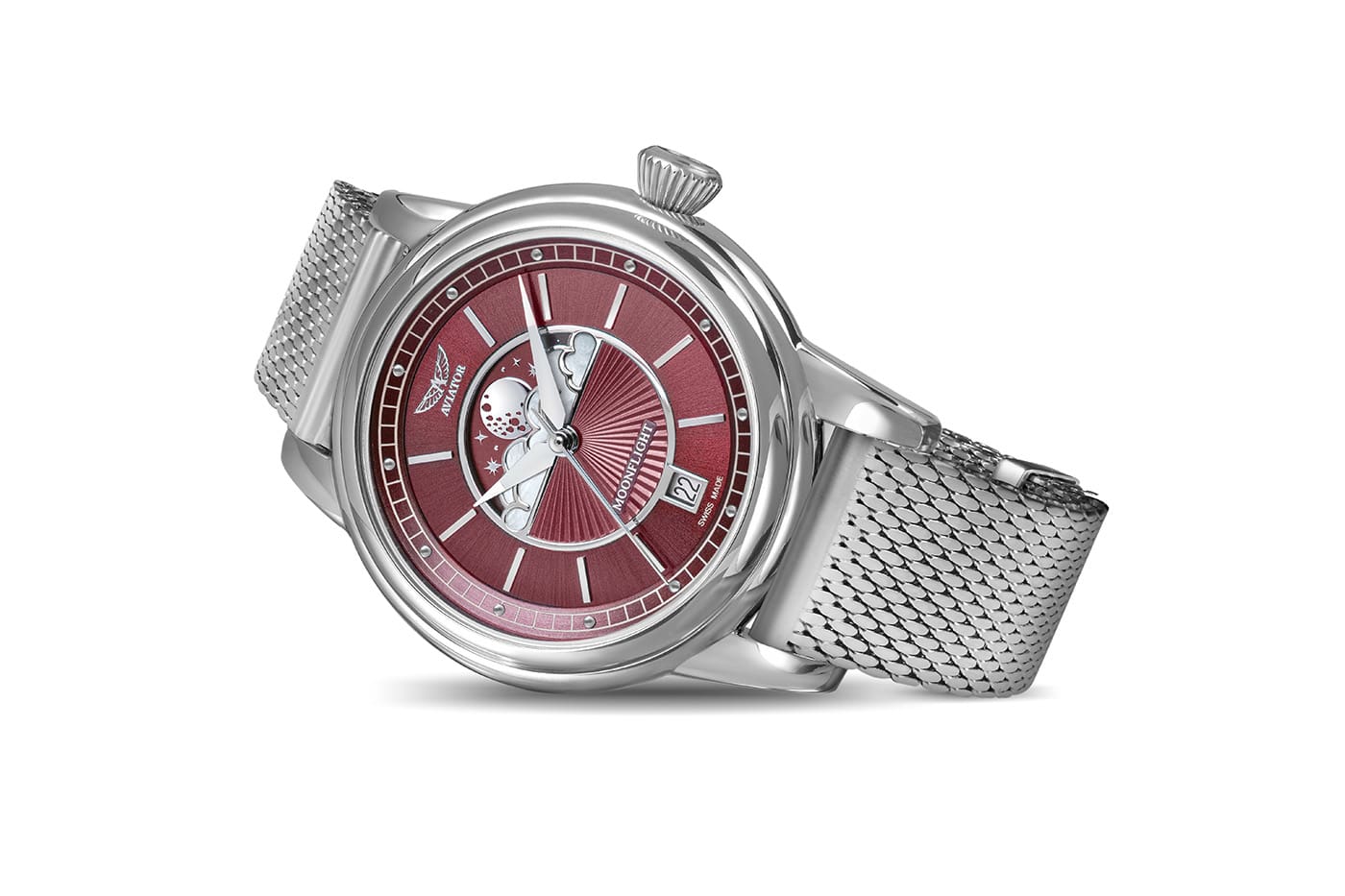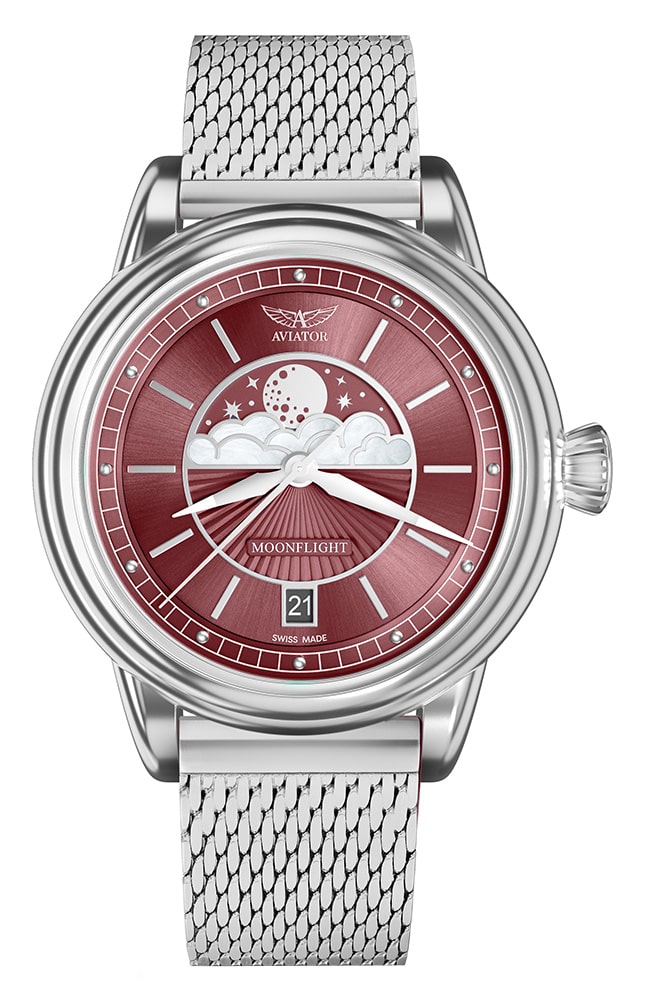 Extrémně tvrdé a proti poškrábání odolné safírové sklíčko s antireflexem chrání ciferník s jemnými ocelovými indexy a ručičkami. Ty jsou vybaveny luminiscenčním materiálem, který vám pomůže odečíst aktuální čas ve tmě. Ciferník zdobí giloš v podobě slunečních paprsků a je vybaven subčíselníkem fáze měsíce. Jedinečný číselník fáze měsíce obsahuje mraky zasazené do jedinečného perleťového rámu, hvězdnou oblohu a zářící měsíc ve všech svých fázích. Funkce fáze měsíce je nejen krásnou ozdobou pro ženské oko, ale také užitečným mechanismem pro pozorování Měsíce bez pohledu z okna. Celý číselník je navržen s 3D vnímáním hloubky. Pod ním je vysoce přesný švýcarský Machineek na baterie. Kromě měření času poskytuje informace o měsíčních fázích a datu, které si našlo své místo na 6. hodině.Tyto stříbrné dámské hodinky Aviator na síťovaném náramku budou perfektním partnerem do kabelky, elegantního kostýmku i bižuterní doplňky.