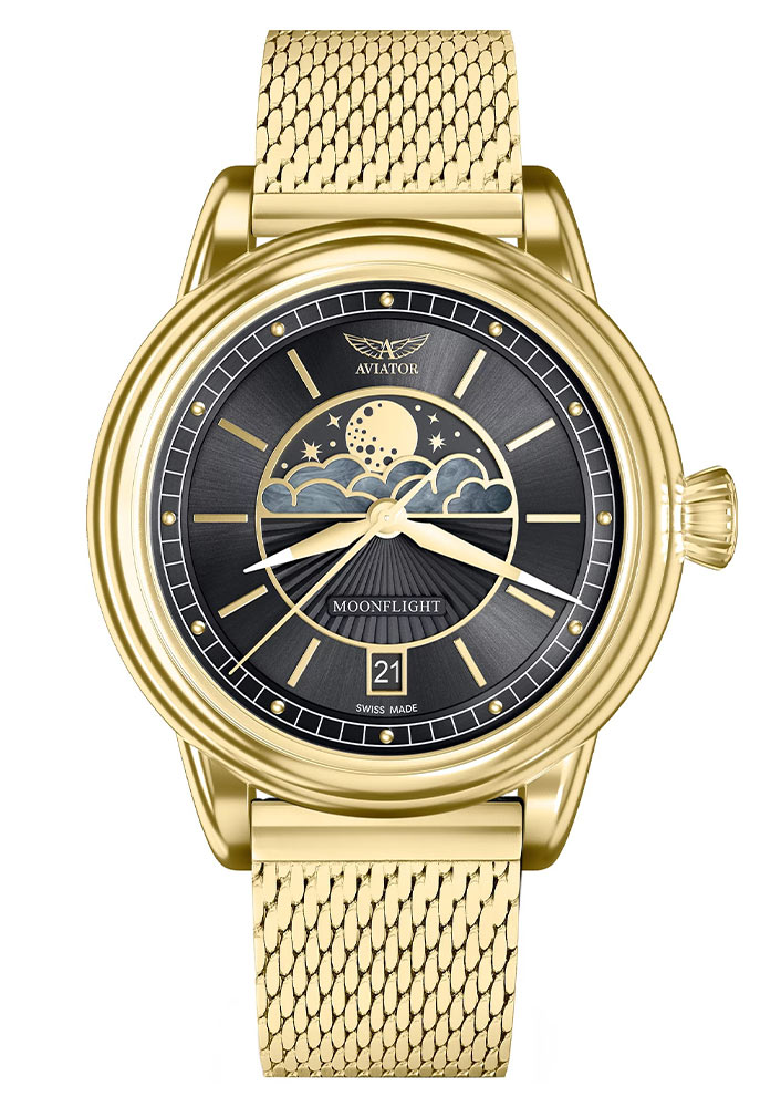 Pod ním se nachází vysoce přesný švýcarský bateriový mechanismus. Kromě měření času poskytuje údaje o měsíčních fázích a datu umístěném na 6. hodině.Tyto pozlacené dámské hodinky Aviator na síťovaném náramku budou perfektním partnerem do kabelek, elegantních kostýmů a šperků.