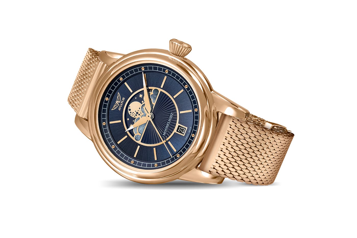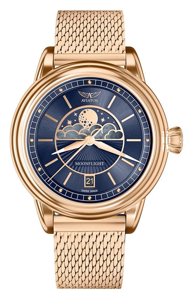 Extrémně tvrdé a proti poškrábání odolné safírové sklíčko s antireflexem chrání ciferník s jemnými ocelovými indexy a ručičkami. Ty jsou vybaveny luminiscenčním materiálem, který vám pomůže odečíst aktuální čas ve tmě. Ciferník zdobí giloš v podobě slunečních paprsků a je vybaven subčíselníkem fáze měsíce. Jedinečný číselník fáze měsíce obsahuje mraky zasazené do jedinečného perleťového rámu, hvězdnou oblohu a zářící měsíc ve všech svých fázích. Funkce fáze měsíce není jen krásnou ozdobou pro ženské oko, ale také užitečným mechanismem pro pozorování Měsíce bez pohledu z okna. Celý číselník je navržen s 3D vnímáním hloubky. Pod ním je vysoce přesný švýcarský Machineek na baterie. Kromě sledování času poskytuje informace o měsíčních fázích a datu, které si našlo své místo na 6. hodině.Tyto pozlacené dámské hodinky Aviator se síťovaným náramkem budou perfektním partnerem do kabelky, elegantní kostýmy a bižuterní doplňky.