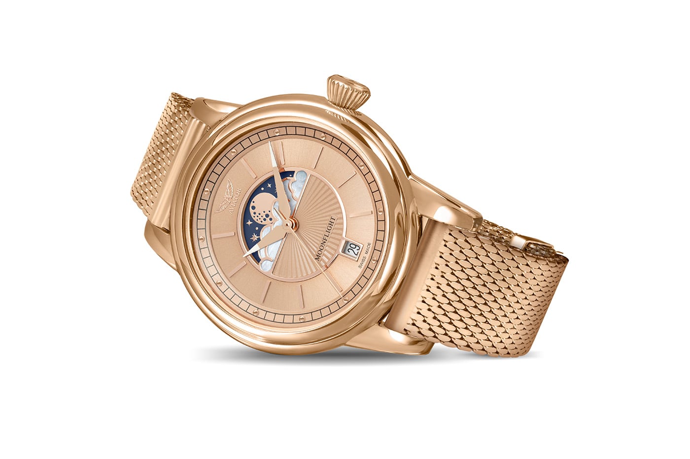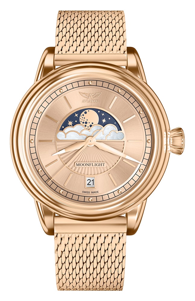 Extrémně tvrdé a proti poškrábání odolné safírové sklíčko s antireflexem chrání ciferník s jemnými ocelovými indexy a ručičkami. Ty jsou vybaveny luminiscenčním materiálem, který vám pomůže odečíst aktuální čas ve tmě. Ciferník zdobí giloš v podobě slunečních paprsků a je vybaven subčíselníkem fáze měsíce. Jedinečný číselník fáze měsíce obsahuje mraky zasazené do jedinečného perleťového rámu, hvězdnou oblohu a zářící měsíc ve všech svých fázích. Funkce fáze měsíce je nejen krásnou ozdobou pro ženské oko, ale také užitečným mechanismem pro pozorování Měsíce bez pohledu z okna. Celý číselník je navržen s 3D vnímáním hloubky. Pod ním je vysoce přesný švýcarský Machineek na baterie. Kromě sledování času poskytuje informace o měsíčních fázích a datu, které si našlo své místo na 6. hodině.Tyto pozlacené dámské hodinky Aviator se síťovaným náramkem budou perfektním partnerem do kabelky, elegantní kostýmy a bižuterní doplňky.