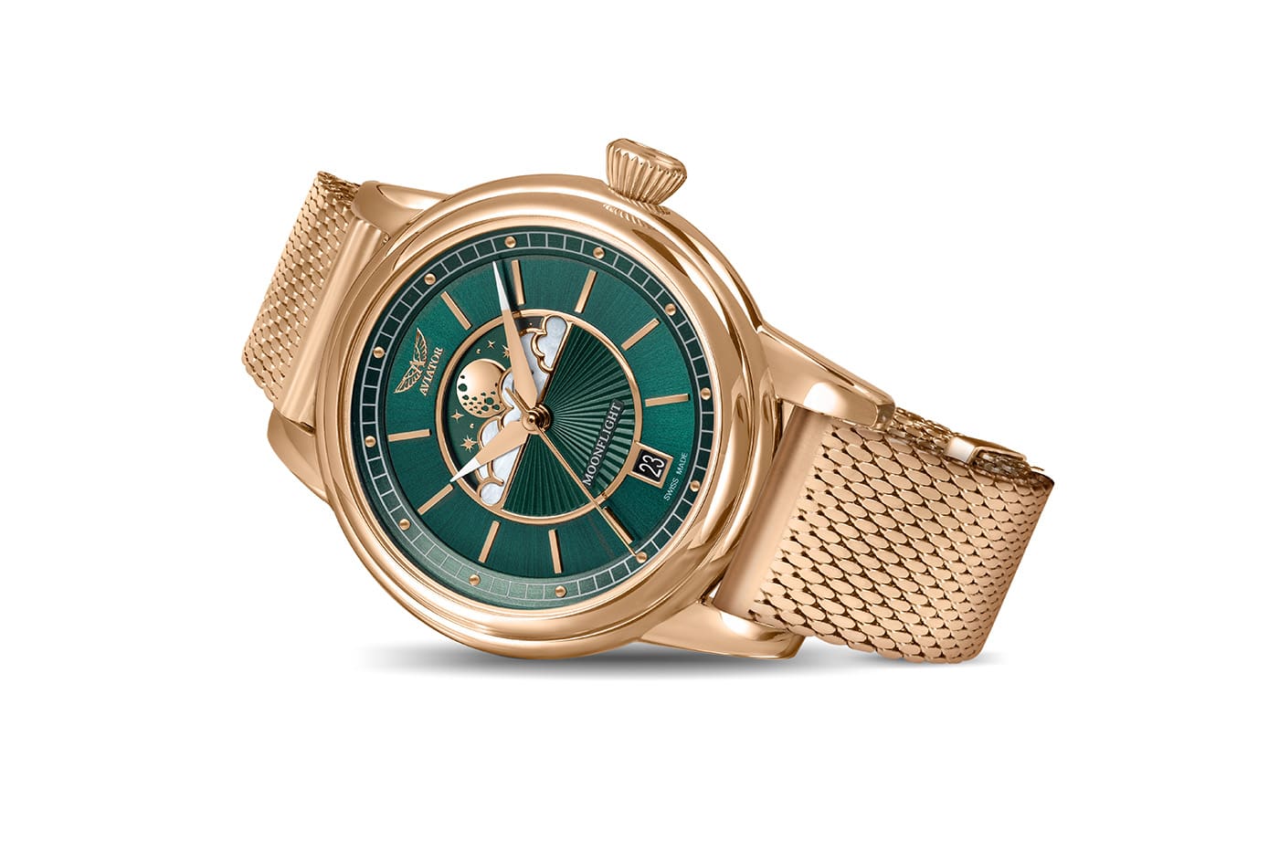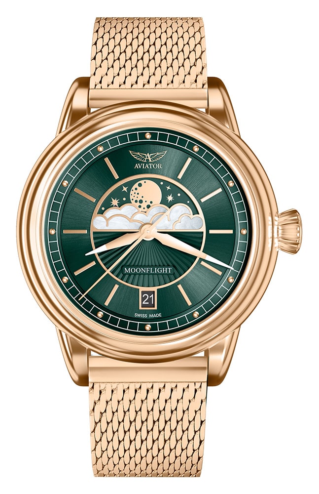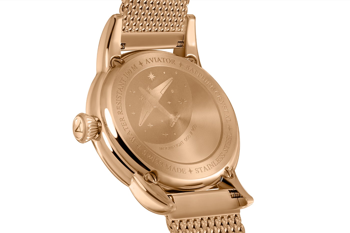 Extrémně tvrdé a proti poškrábání odolné safírové sklíčko s antireflexem chrání ciferník s jemnými ocelovými indexy a ručičkami. Ty jsou vybaveny luminiscenčním materiálem, který vám pomůže odečíst aktuální čas ve tmě. Ciferník zdobí giloš v podobě slunečních paprsků a je vybaven subčíselníkem fáze měsíce. Jedinečný číselník fáze měsíce obsahuje mraky zasazené do jedinečného perleťového rámu, hvězdnou oblohu a zářící měsíc ve všech svých fázích. Funkce fáze měsíce je nejen krásnou ozdobou pro ženské oko, ale také užitečným mechanismem pro pozorování Měsíce bez pohledu z okna. Celý číselník je navržen s 3D vnímáním hloubky. Pod ním je vysoce přesný švýcarský Machineek na baterie. Kromě sledování času poskytuje informace o měsíčních fázích a datu, které si našlo své místo na 6. hodině.Tyto pozlacené dámské hodinky Aviator se síťovaným náramkem budou perfektním partnerem do kabelky, elegantní kostýmy a bižuterní doplňky.